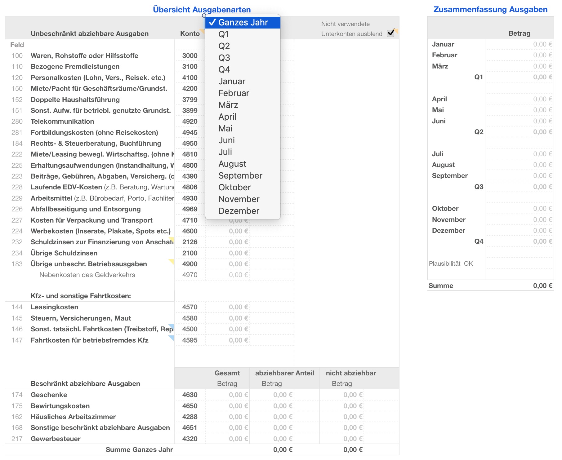 • Die Übersicht der Einnahmen und Ausgaben kann nach monaten und Quartalen gefiltert werden