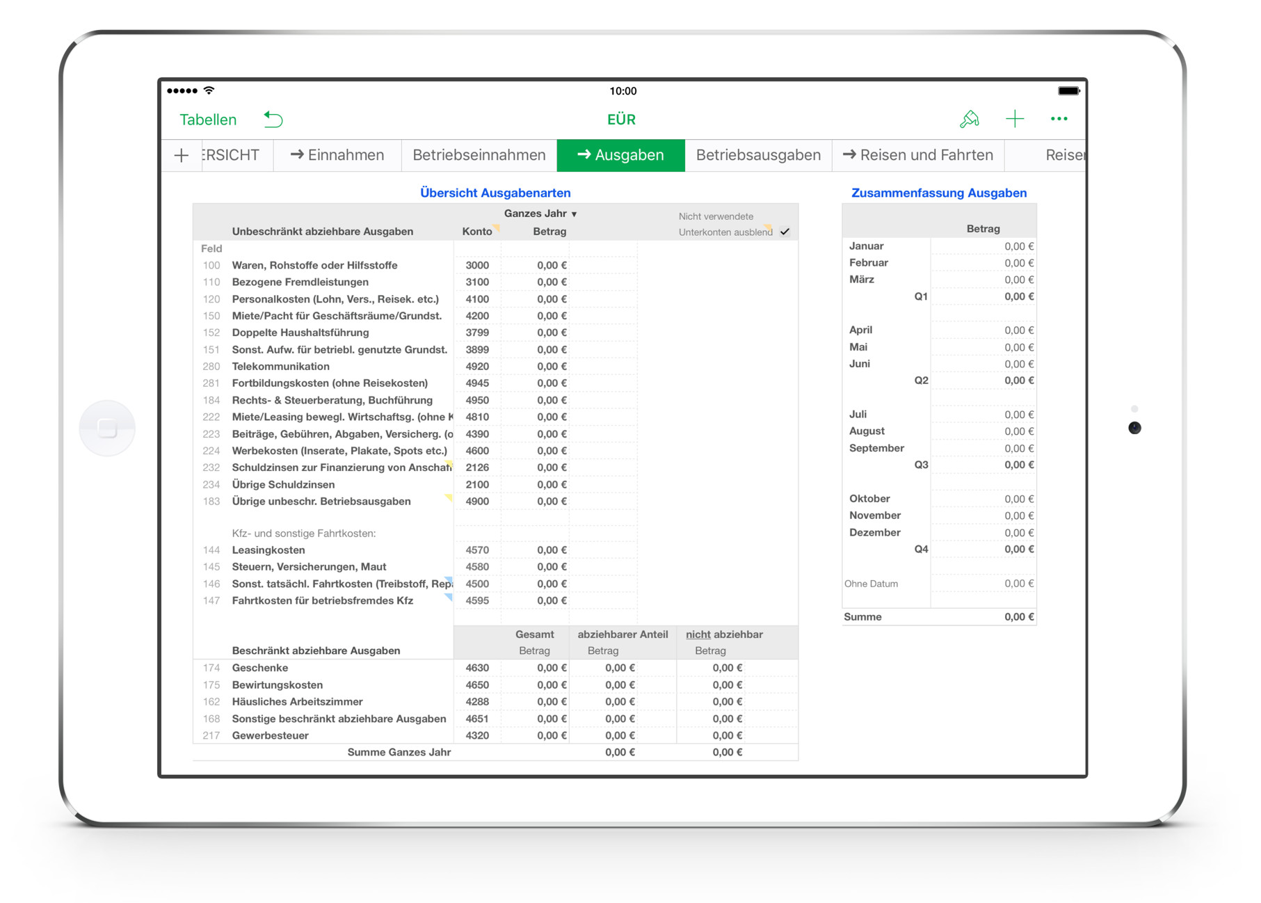 Ihre Einnahmen, Ausgaben, Reisen etc. geben Sie in die Tabellenblätter ein. Die Monats- und Quartalssummen werden daraus errechnet und für die Gewinnermittlung das Geschäftsjahr ausgewertet.