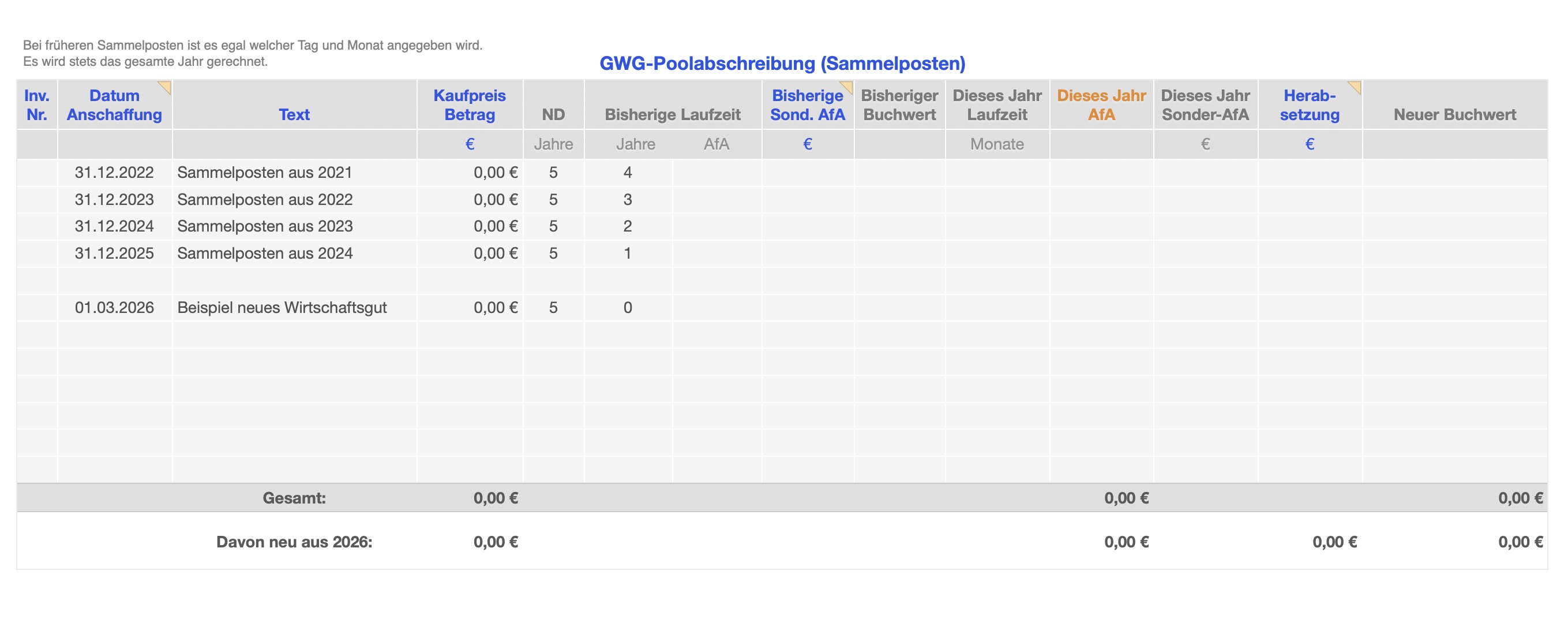 • Listen und AfA-Berechnung für GWG Sofortabschreibung und Sammelposten, bewegliche, unbewegliche und immaterielle Wirtschaftsgüter
