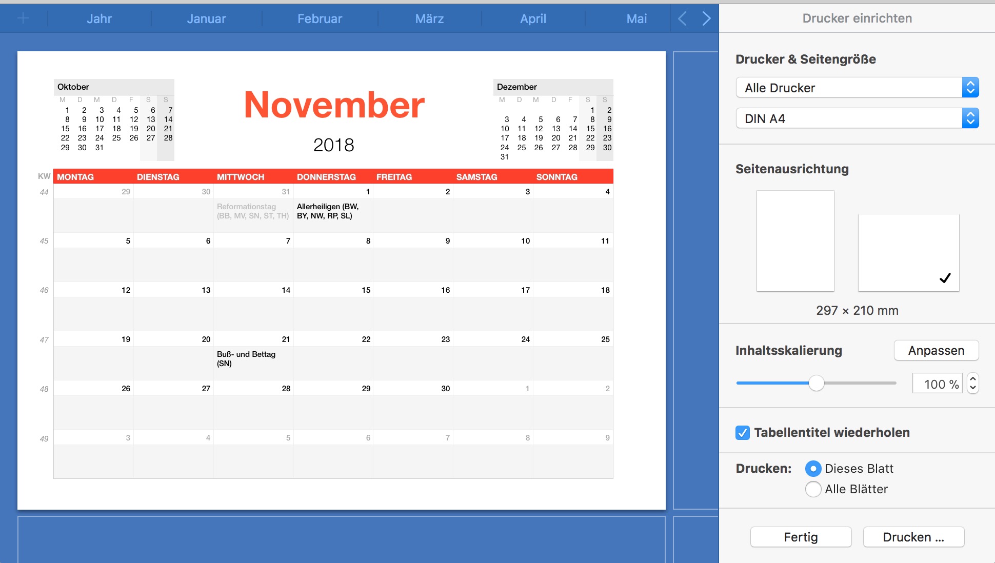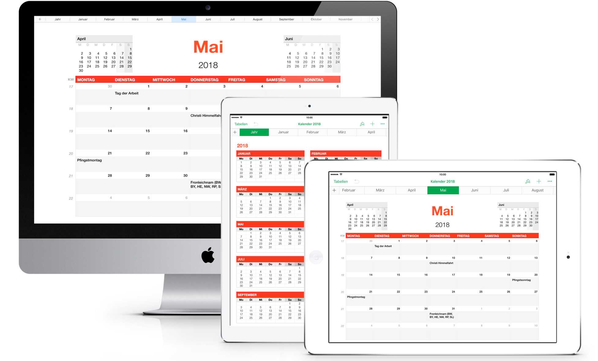 Der Kalender für 2018 eignet sich zum Ausdrucken und für den Bildschirm auf Mac und iPad. Jeder Monat ist auf seinem eigenen Blatt und ist mit Kalenderwochen versehen. Für jeden Tag gibt es Platz für Einträge.