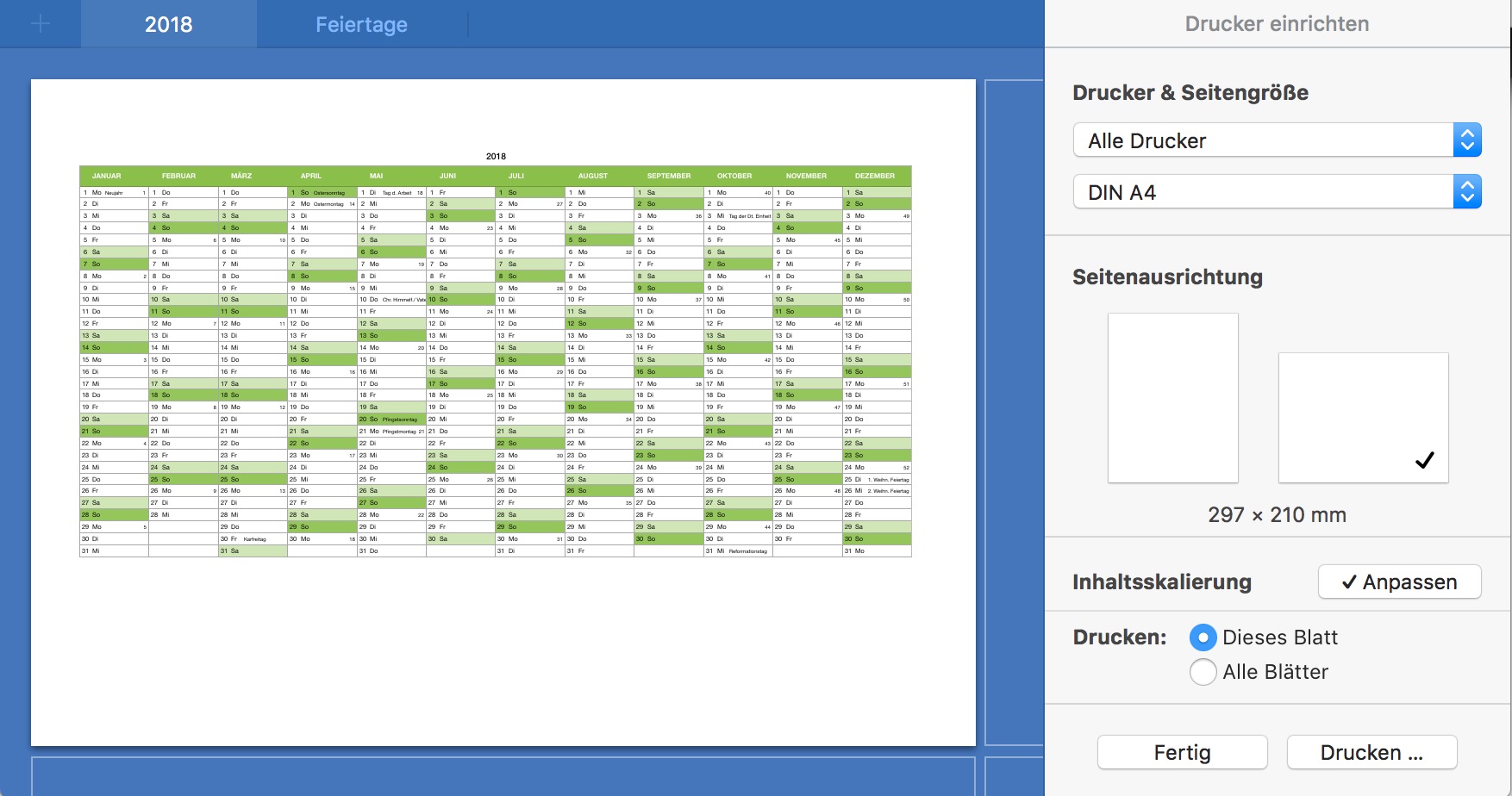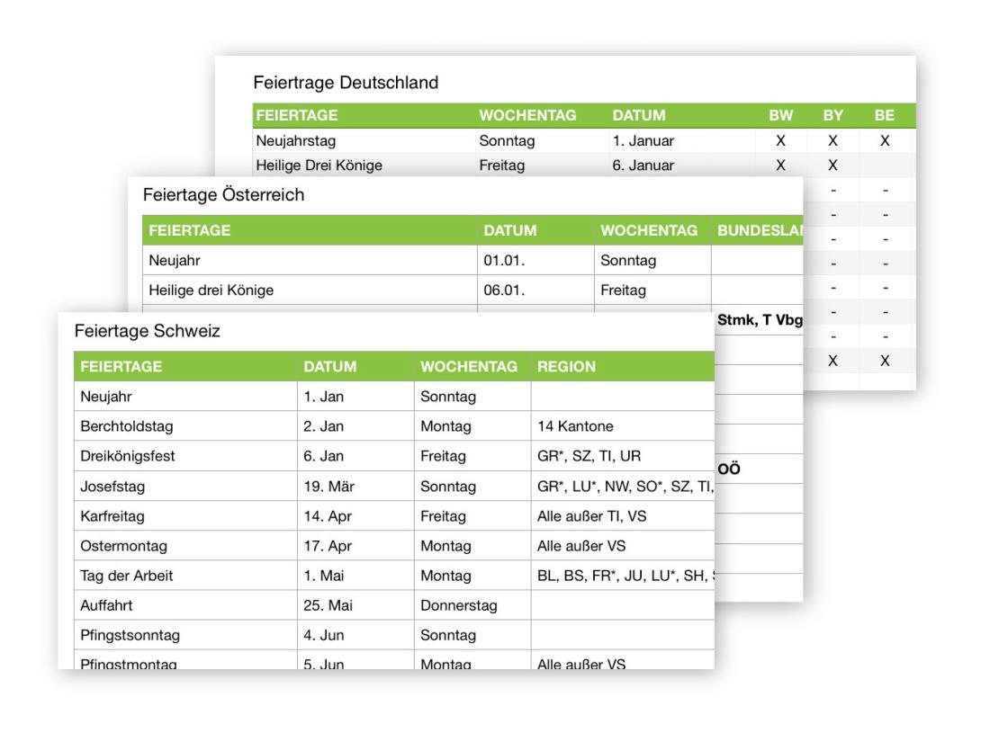 Kalenderwochen und gesetzliche bundesweite Feiertage für Detuschland sind bereits im Jahresüberblick eingetragen. Feiertage für Bundesländer sind in einer separaten Tabelle nach Bundesland aufgelistet. Zwei weitere Tabellen zeigen die Feiertage für Österreich und die Schweiz ebenfalls nach Bundesländern bzw. Regionen.