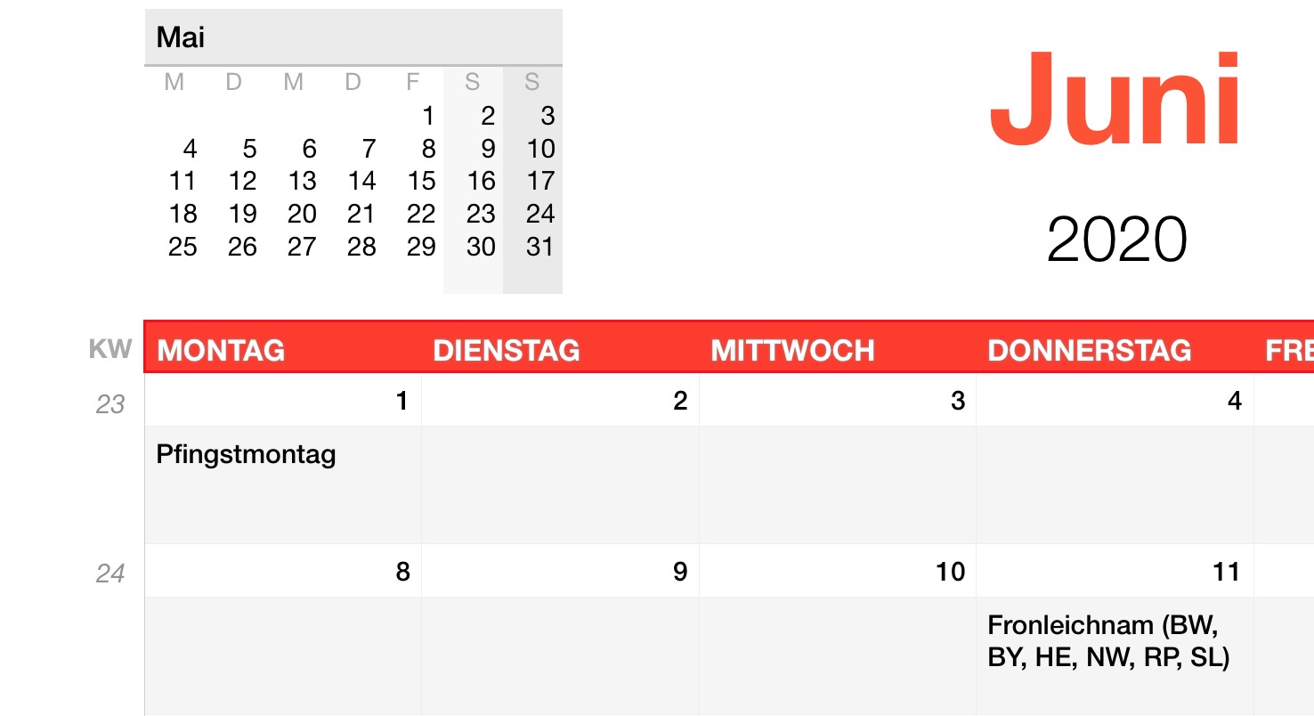 Der Kalender für 2020 eignet sich zum Ausdrucken und für den Bildschirm auf Mac und iPad. Jeder Monat ist auf seinem eigenen Blatt und ist mit Kalenderwochen versehen. Für jeden Tag gibt es Platz für Einträge.
