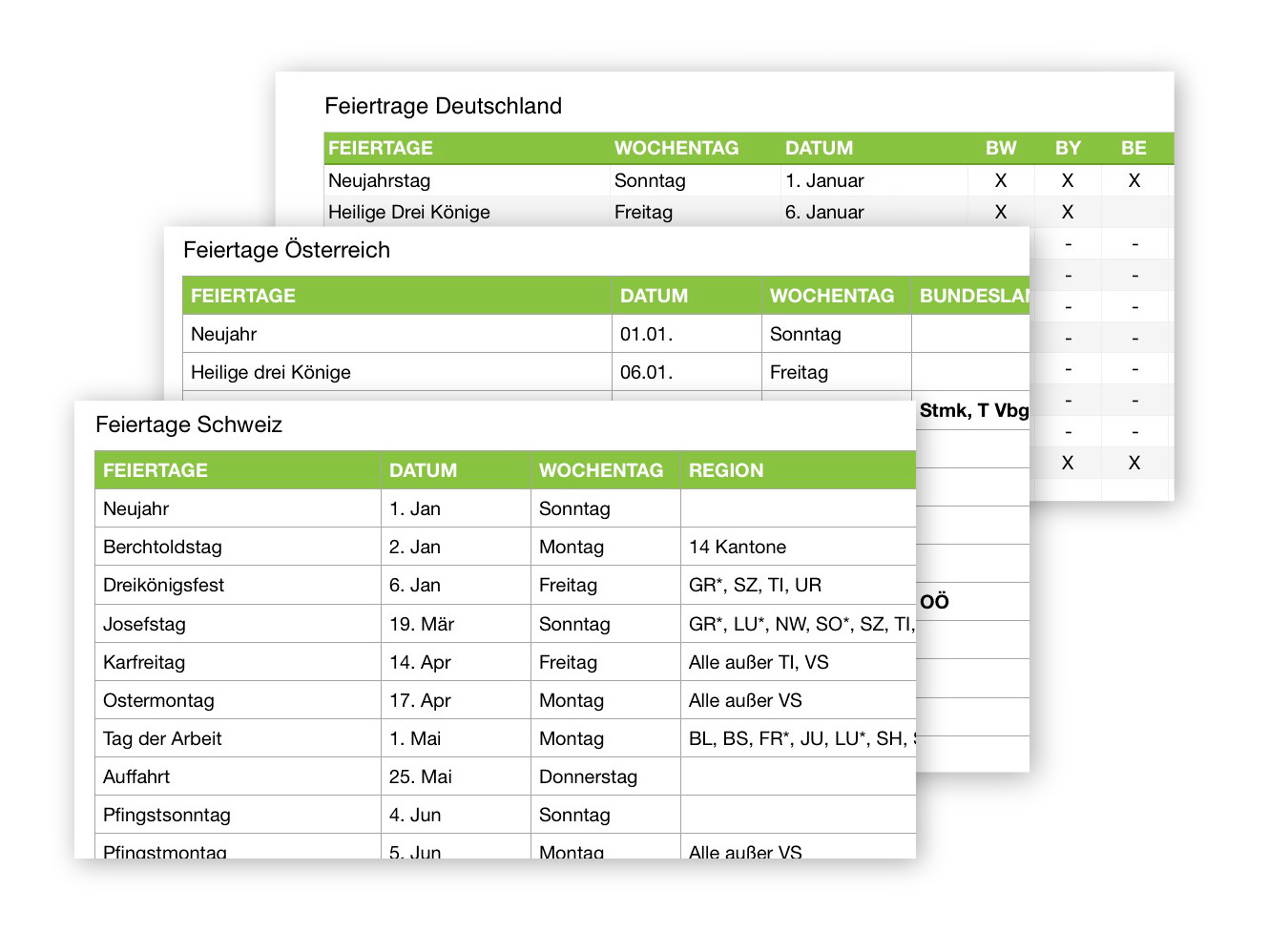 Die bundesweiten Feiertage für Deutschland sind bereits eingetragen. In weiteren Tabellen sind die Feiertrage nach Bundesländern für Deutschland, Österreich und die Schweiz dargestellt.