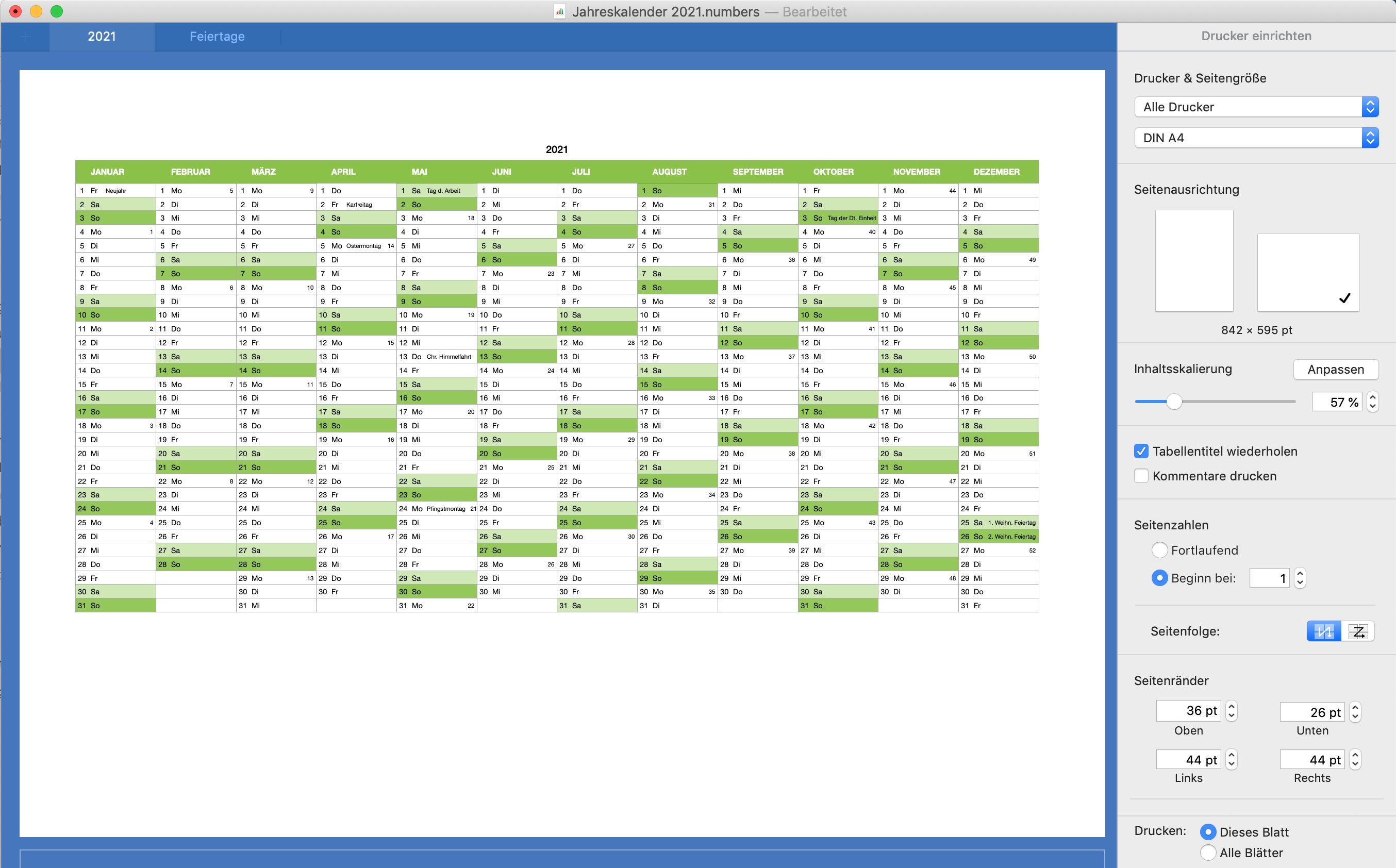 Der Jahreskalender stellt das gesamte Jahr 2021 auf einem Blatt übersichtlich dar. Er lässt sich ausdrucken oder am Bildschirm nutzen und bearbeiten.