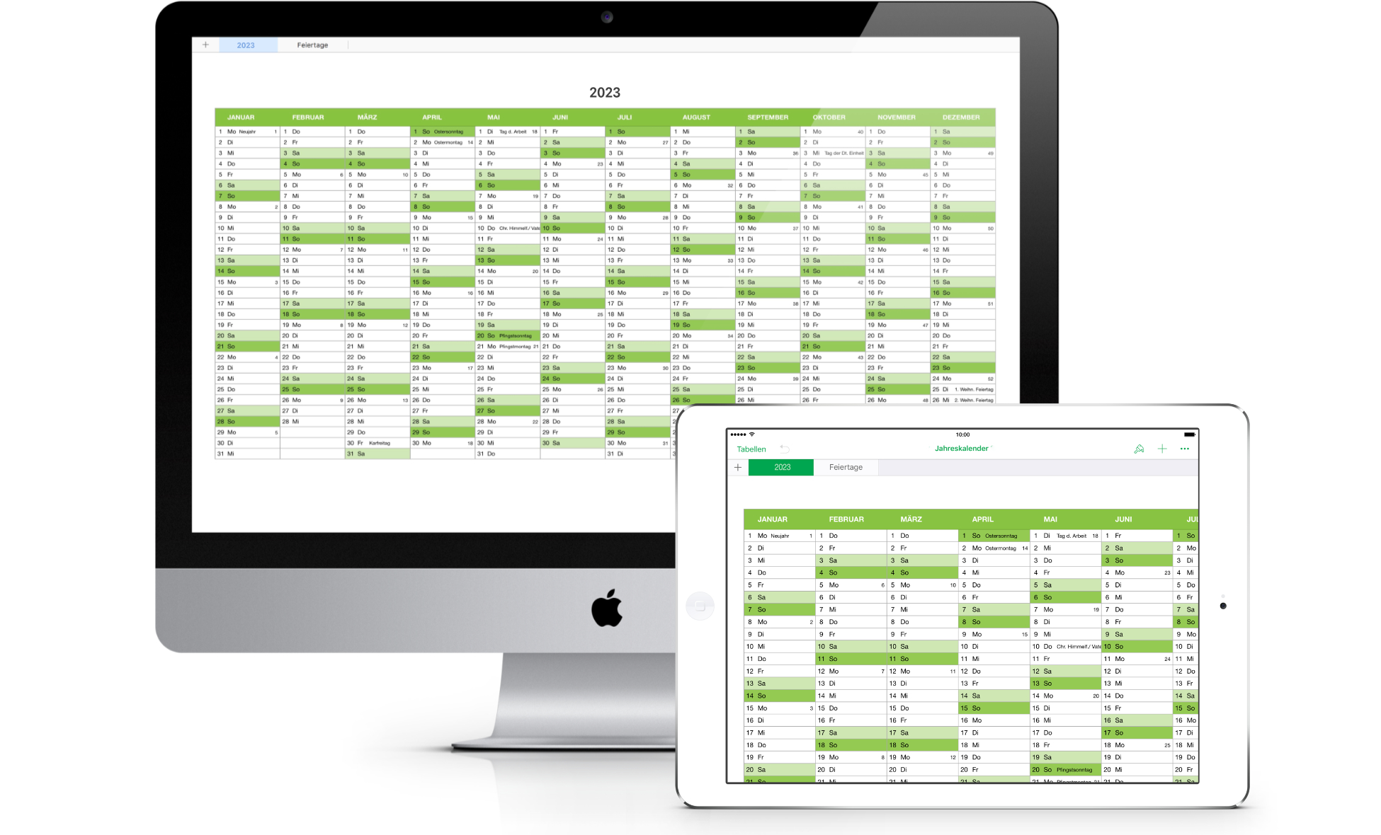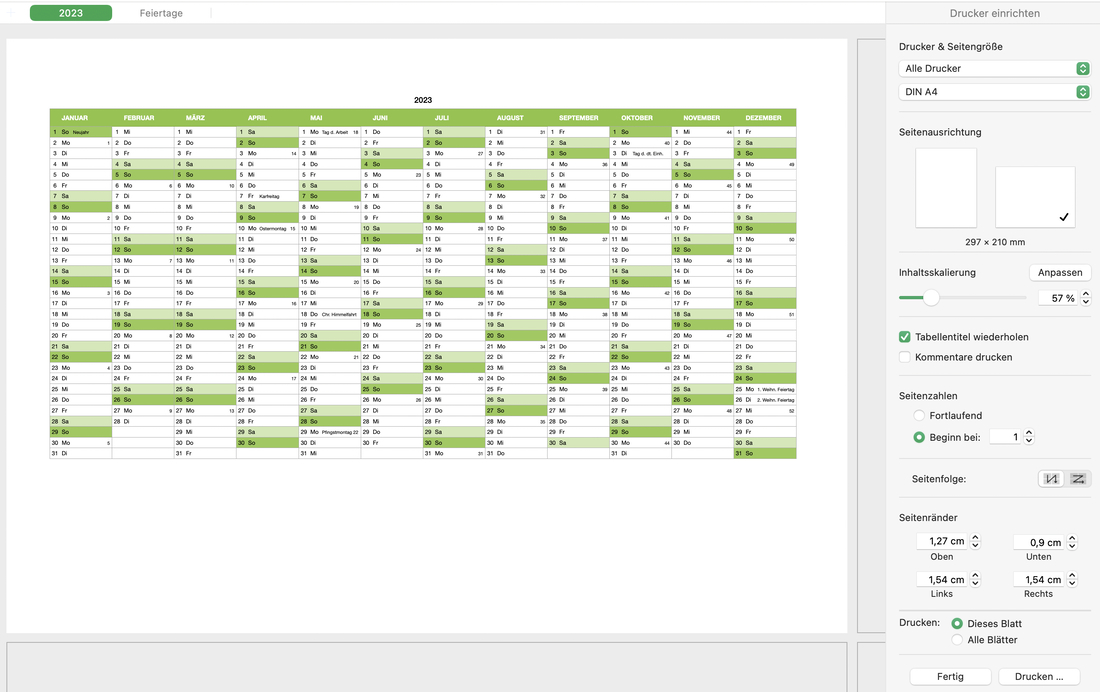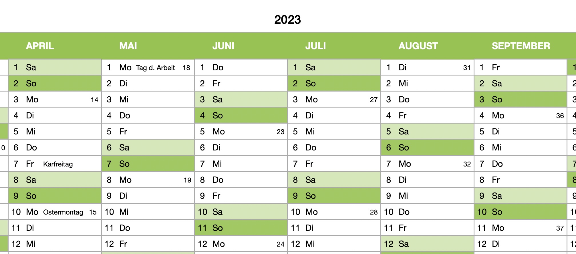 Der Jahreskalender stellt das gesamte Jahr 2023 auf einem Blatt übersichtlich dar. Er lässt sich ausdrucken oder am Bildschirm nutzen und bearbeiten.