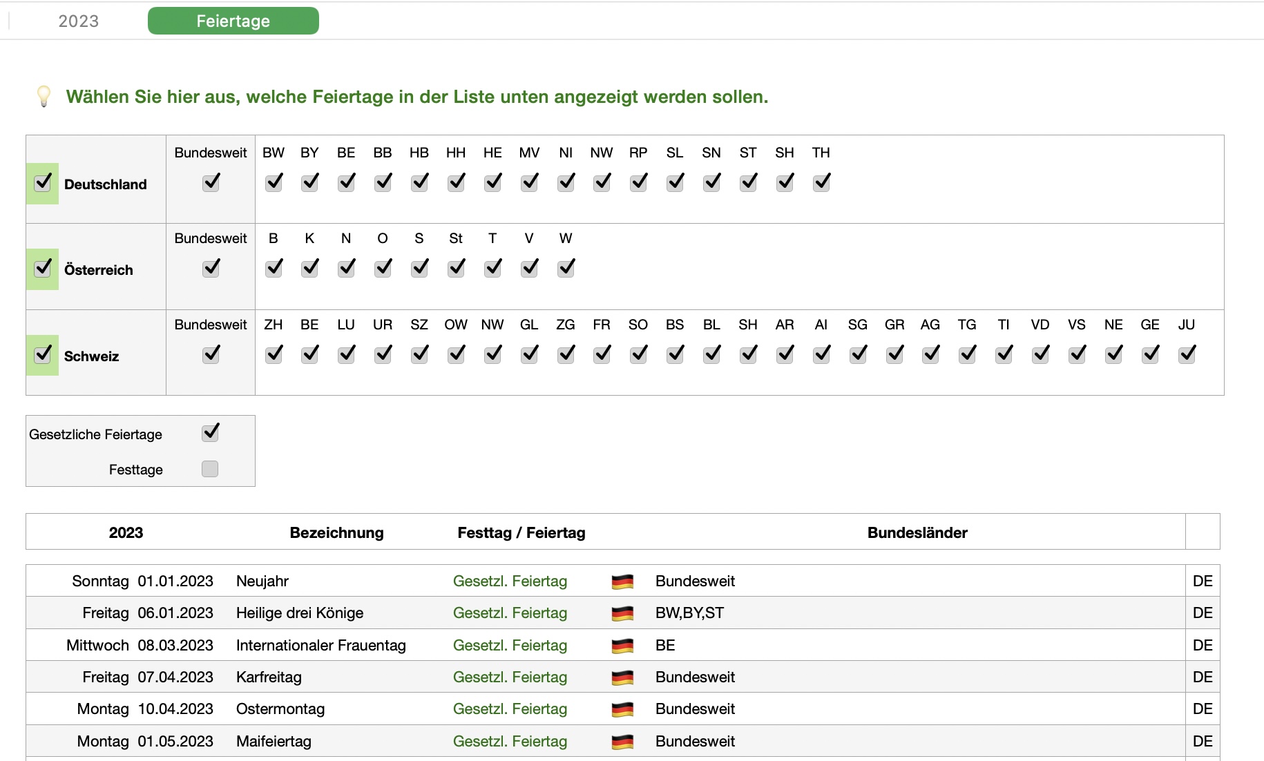 Alle Feiertage für die einzelnen Bundesländer in Deutschland, Österreich und der Schweiz sind in einer separaten Tabelle aufgelistet und können gefiltert werden nach Land, Bundesland und gesetzlichen Feiertagen oder Festtagen.
