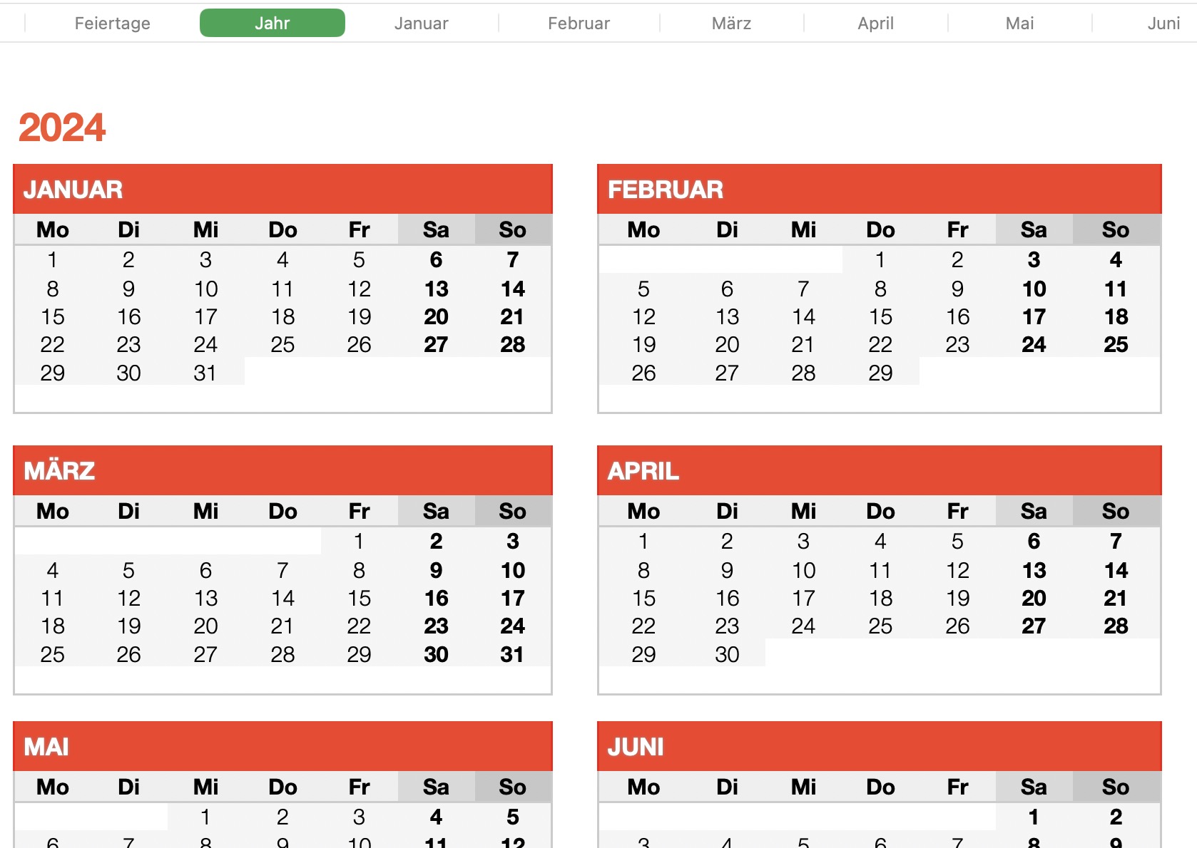 Der Kalender für 2024 eignet sich zum Ausdrucken und für den Bildschirm auf Mac und iPad. Jeder Monat ist auf seinem eigenen Blatt und ist mit Kalenderwochen versehen. Für jeden Tag gibt es Platz für Einträge.