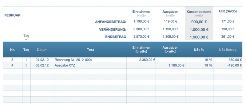 - Einfachste eingabe ohne Maus: Nur 5 Werte per Tab-Taste (Nummer, Tag, Text, Betrag, Steuersatz)