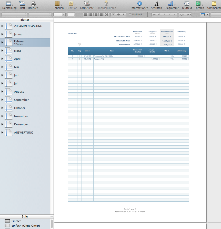 Kassenbuch zur Erfassung von Einnahmen und Ausgaben für 2012 inklusive Mehrwertseuer. Für jeden Monat gibt es eine Tabelle mit 250 Zeilen, es können beliebig viele hinzugefügt werden.
