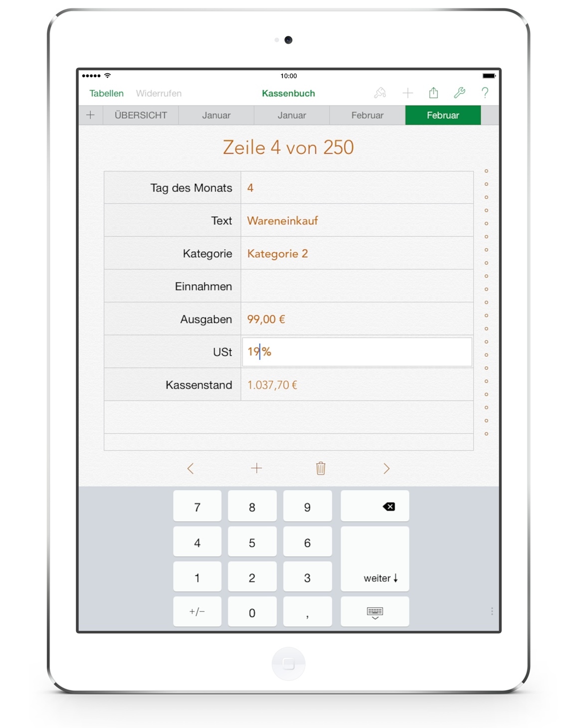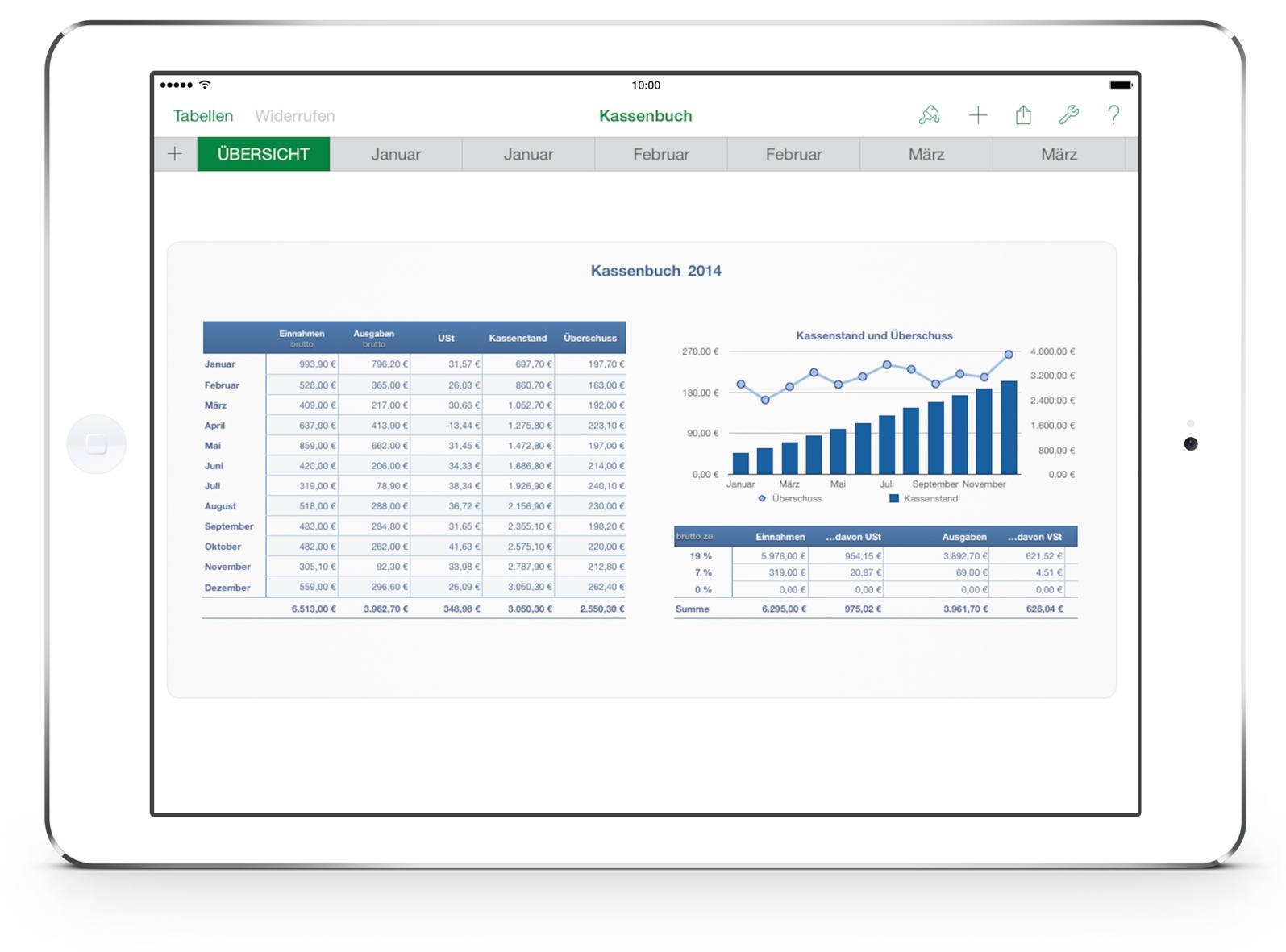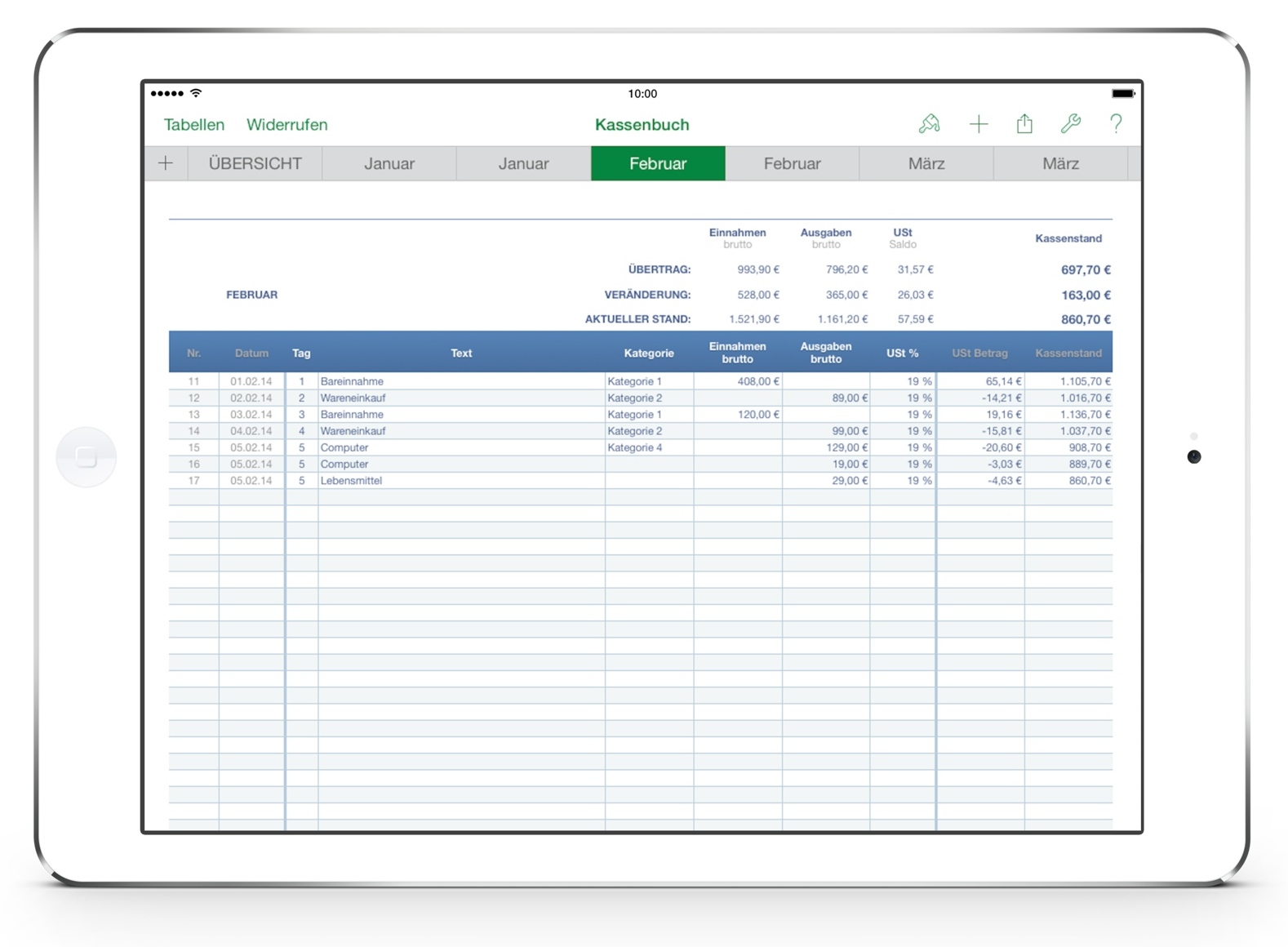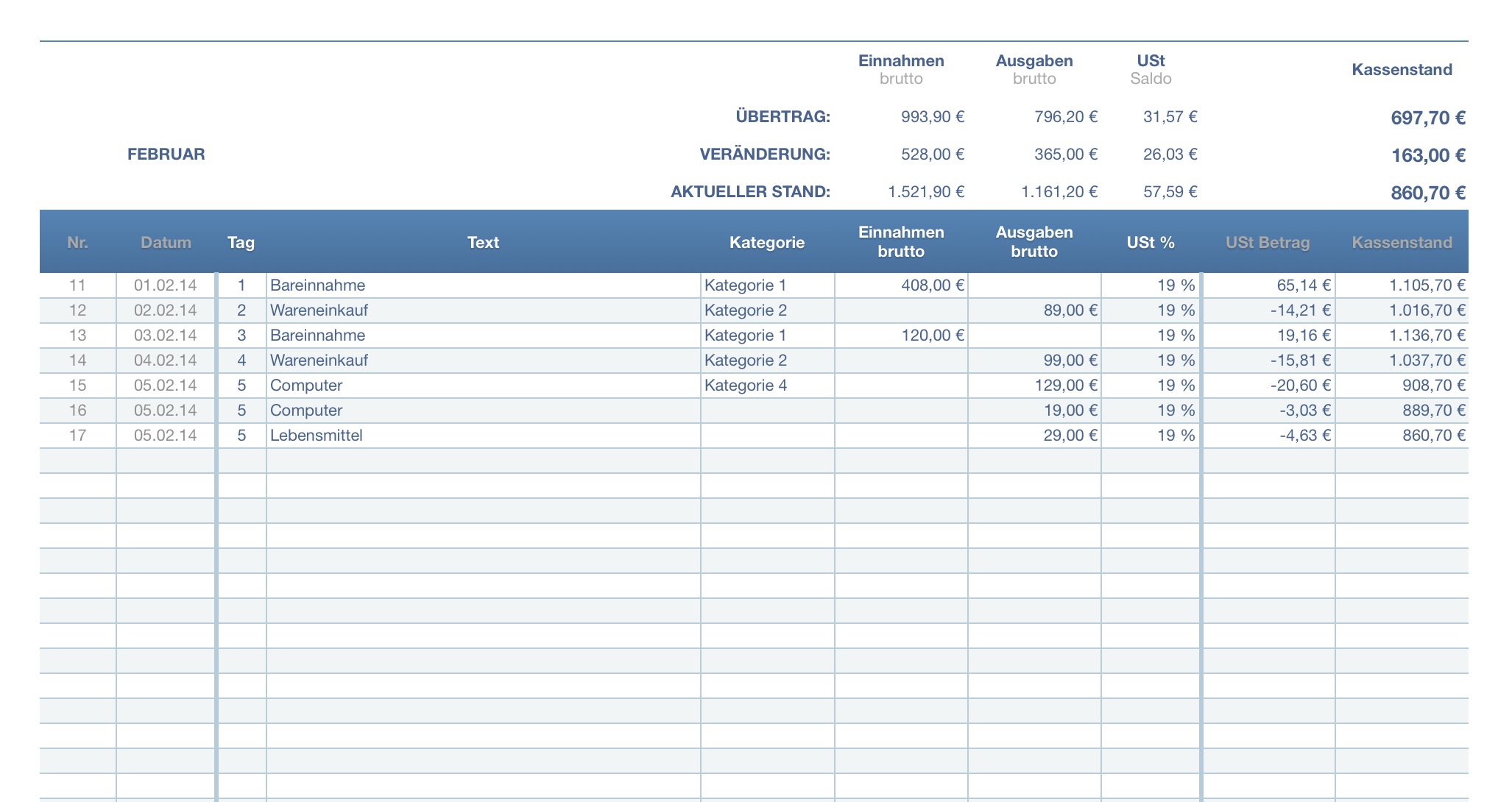 Jeder Monat zeigt die Summe der Einnahmen, Ausgaben, Umsatzsteuer und den Kassenbestand zeilengenau an. Die Salden werden in den nächsten Monat übertragen. Es können mehrere USt-Sätze verwendet werden, z.B. 19%, 7% und 0%.