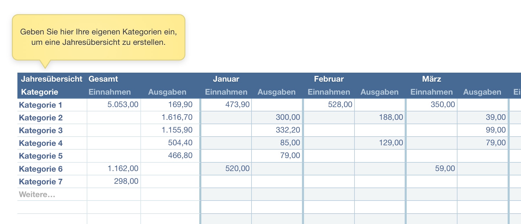 Es steht ebenfalls eine detailliertere Auswertung nach Kategorien und Monaten zur Verfügung. Kategorien können verwendet werden, um eine bessere Übersicht zu erhalten. In der Auswertung stehen dafür 15 Zeilen für je eine Kategorie zur Verfügung. Es können weitere hinzugefügt werden. Tragen Sie hier die Kategorien ein, die Sie bei der Erfassung verwenden. Diese werden dann nach ihren monatlichen Summen dargestellt.