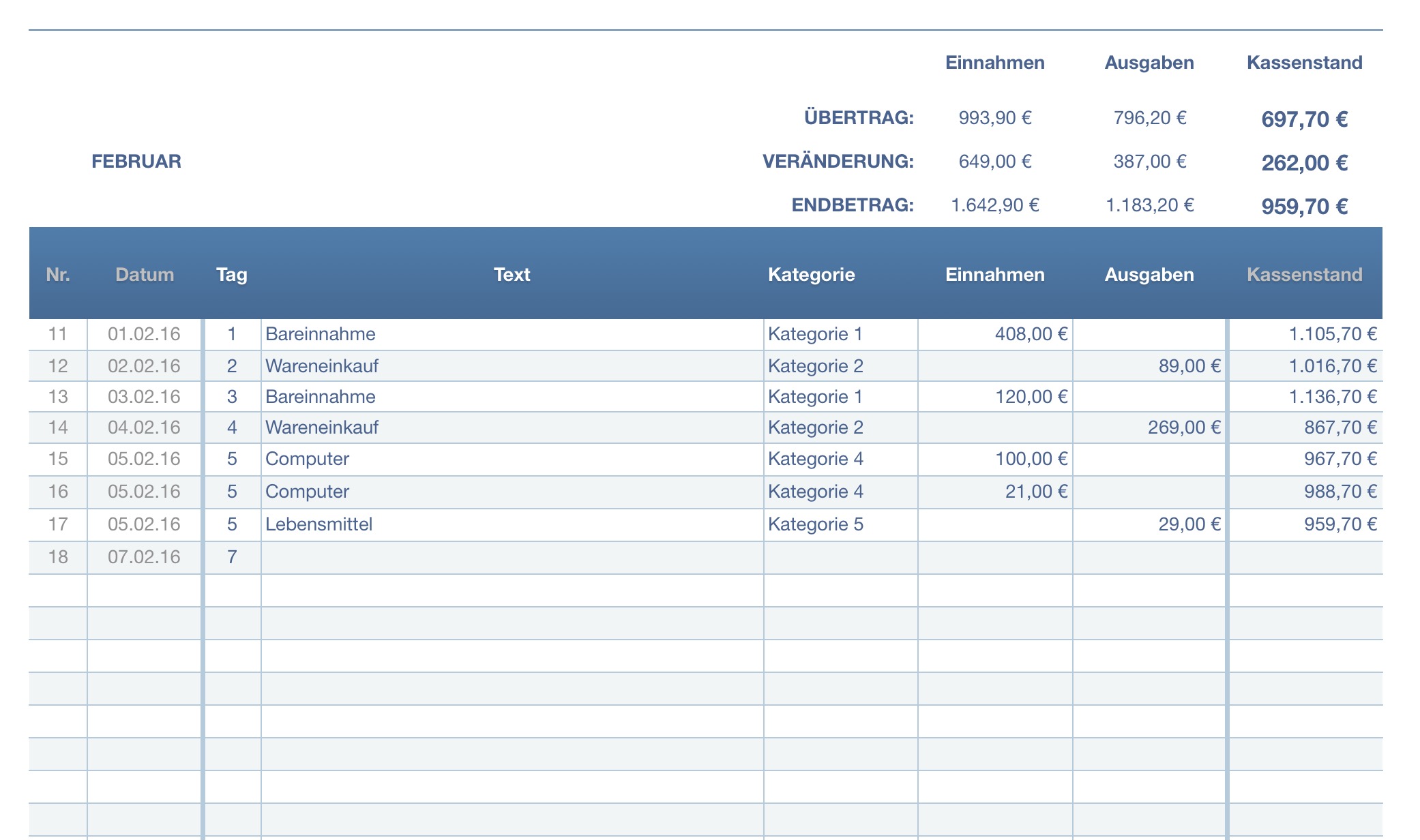 Jeder Monat zeigt die Summe der Einnahmen, Ausgaben und den Kassenbestand zeilengenau an. Die Salden werden in den nächsten Monat übertragen.