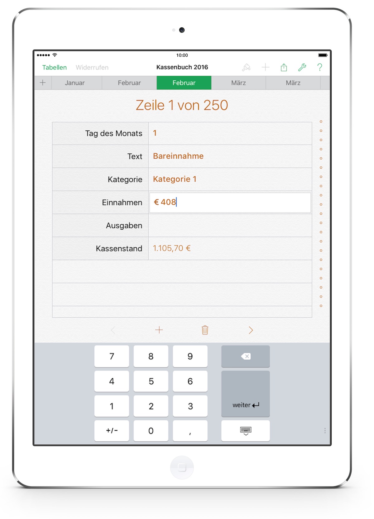 - Text (Beschreibung der Einnahme oder Ausgabe)