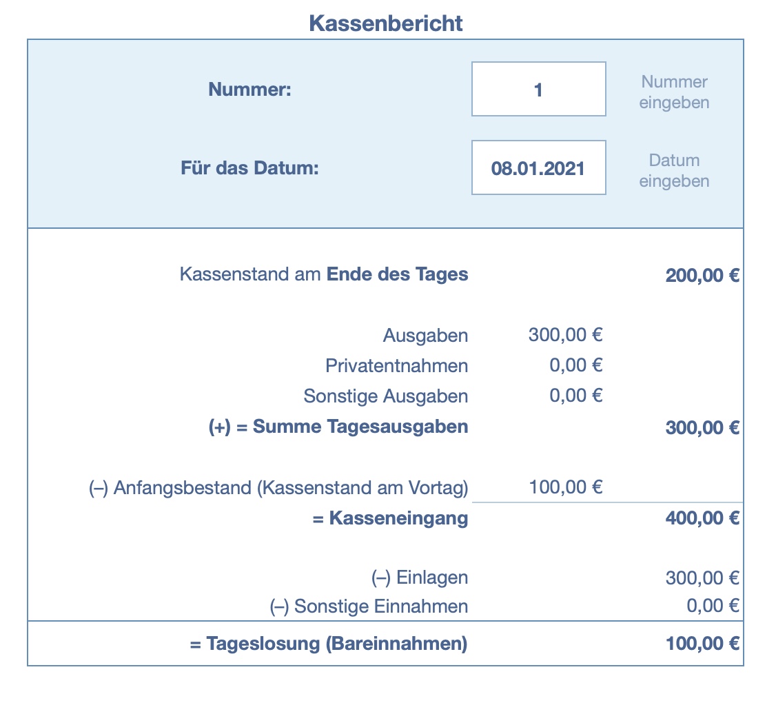 - Tagesliste mit jeweiligen Anfangs- und Endstand der Kasse pro Tag für einen gesamten Monat