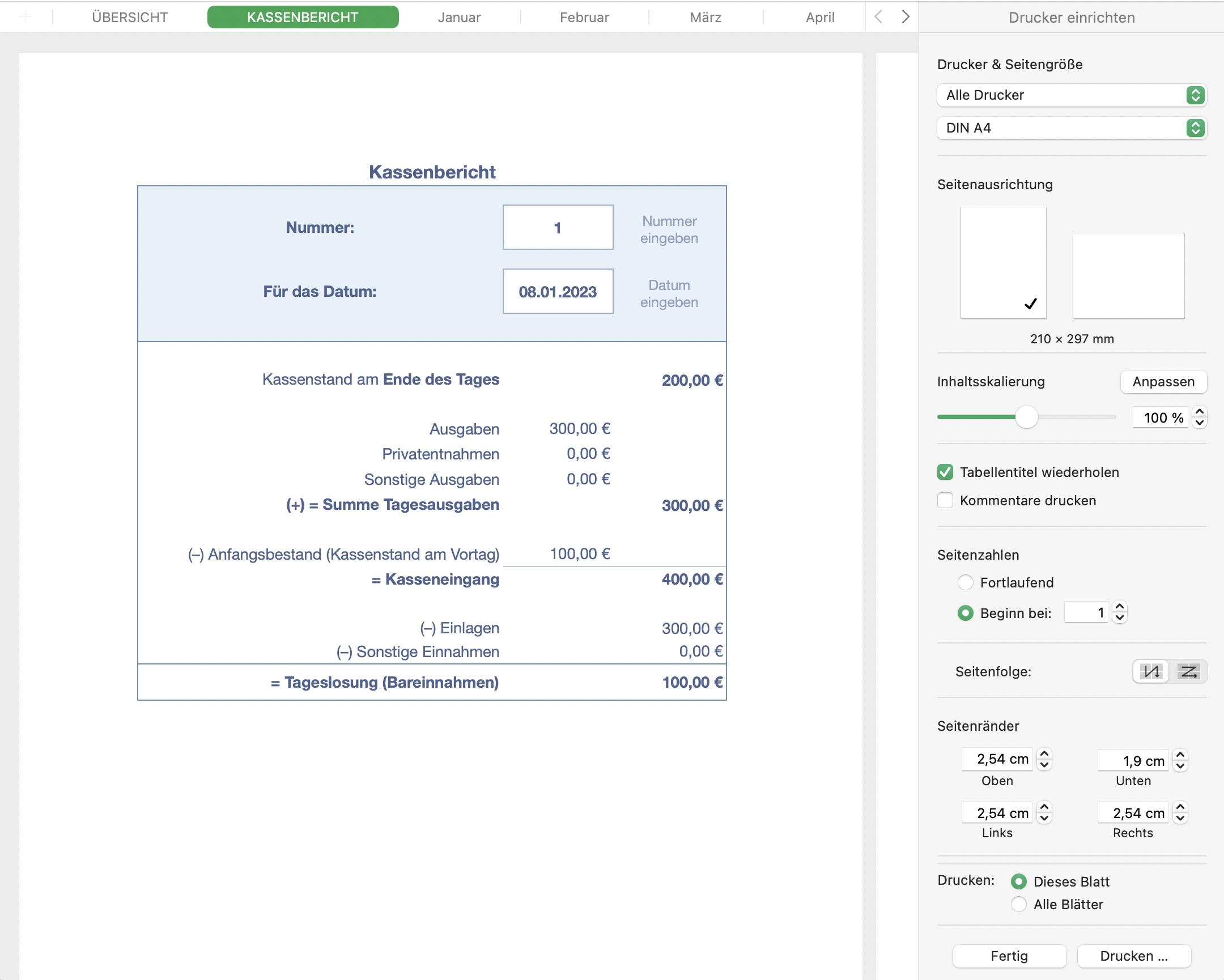 - Tagesliste mit jeweiligen Anfangs- und Endstand der Kasse für einen gesamten Monat