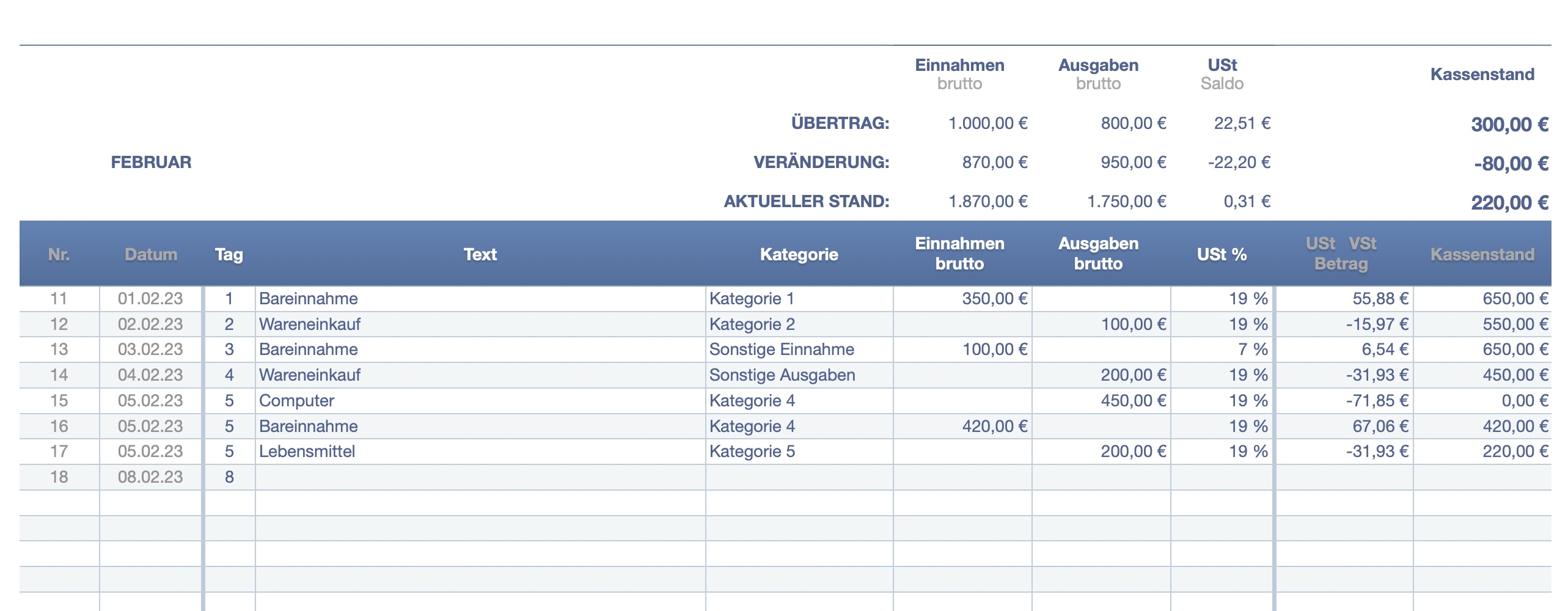 Jeder Monat zeigt übersichtlich die Summe der Einnahmen, Ausgaben, Umsatzsteuer und den Kassenbestand zeilengenau an. Die Salden und Zeilennummern werden in den nächsten Monat übertragen. Es können bis zu drei unterschiedliche USt-Sätze verwendet werden, z.B. 19%, 7% und 0% oder auch 20%, 10% und 0%.
