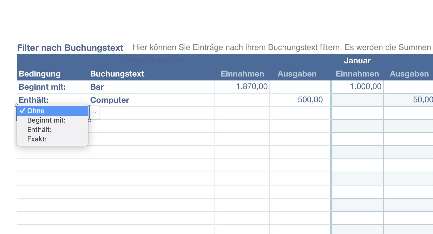Filter nach Buchungstext: In der Zusammenfassung können Sie nach Wörtern oder Wortkombinationen filtern und die Summen über die Monate hinweg anzeigen lassen. Z.B. Filtern nach dem Wort "Spende" zeigt die Summen aller Einträge mit diesem Wort an wie Spende, Spenden, Spende an X, Spende von Y, etc. Es kann gefiltert werden mit der Bedingung "Beginnt mit", "Enthält" oder "Exakt" (Buchungstext muss dem Suchtext exakt übereinstimmen).