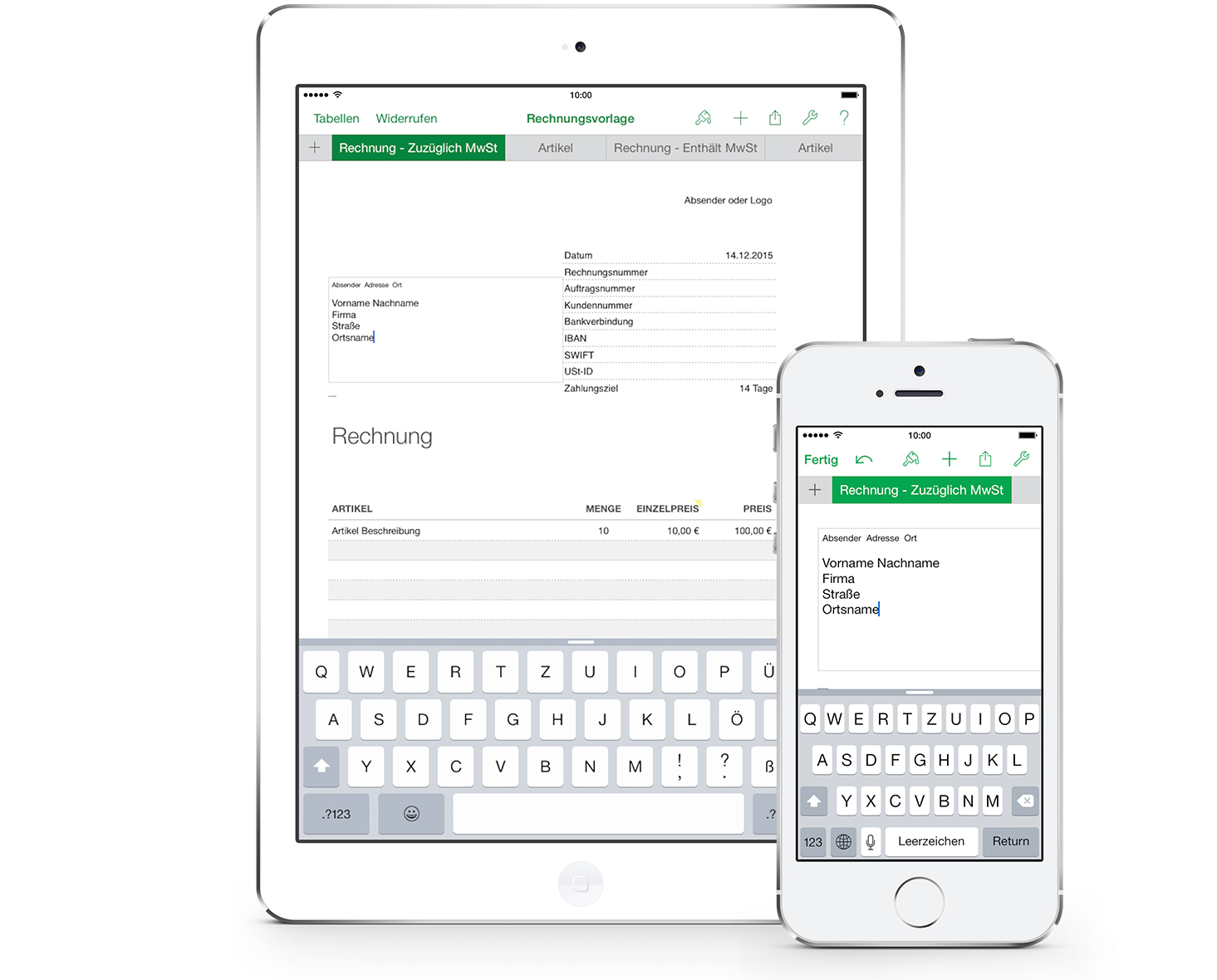 Auf dem iPad und iPhone stehen Eingabeformulare für die Rechnungspositionen zur Verfügung.
