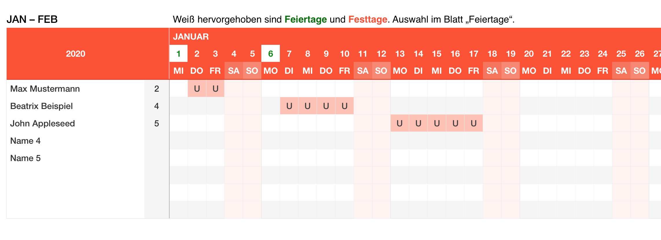 Tragen Sie den Namen ein und markieren Sie die Urlaubstage mit einem U oder X oder einem Leerzeichen. Diese werden als volle Urlaubstage gezählt. Halbe Urlaubstage können mit H oder -  (Minuszeichen) gekennzeichnet werden. Diese zählen 0,5 Urlaubstage.