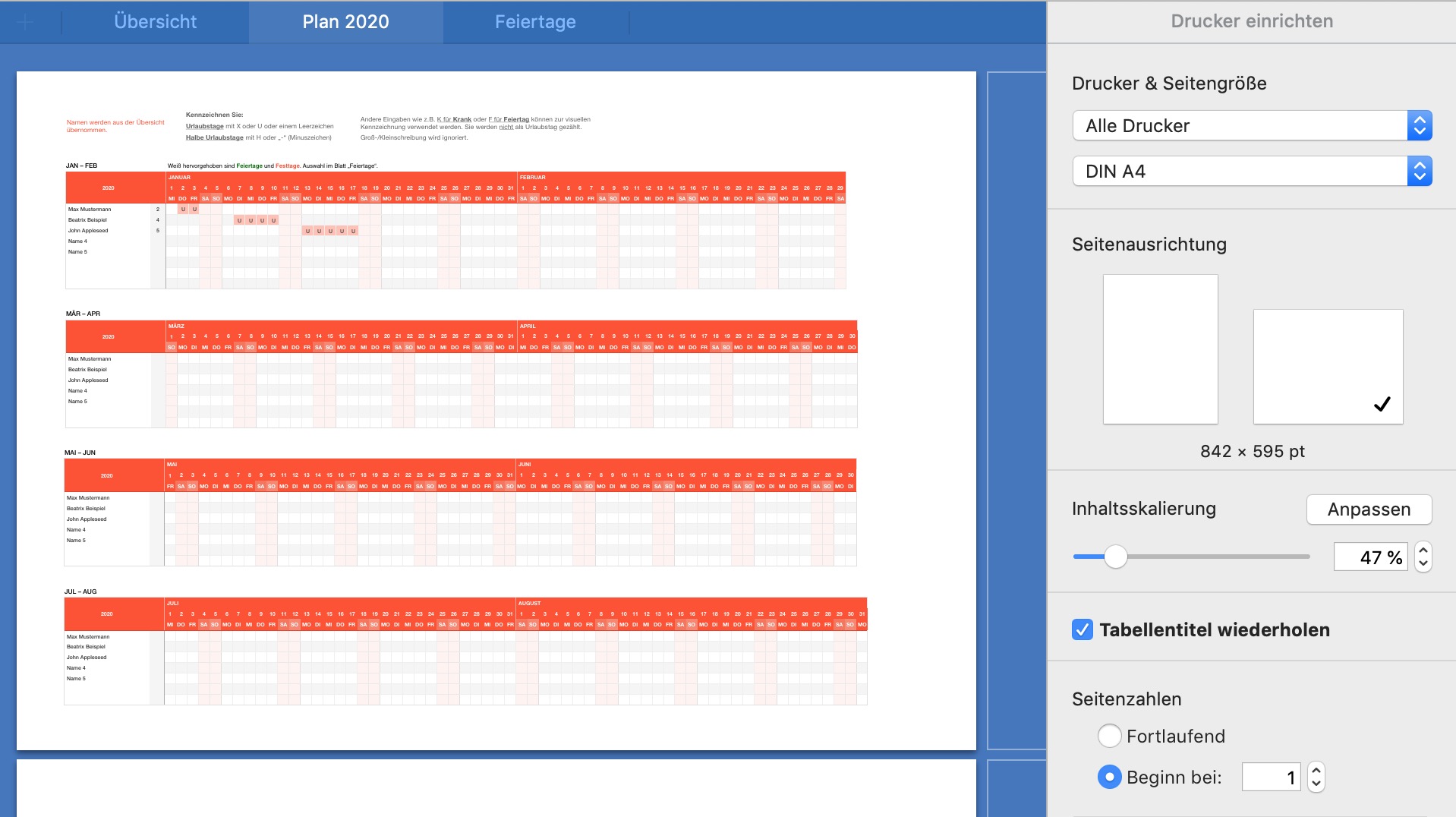 Alle 12 Monate werden auf einem Blatt in 6 Tabellen (je 2 Monate) untereinander dargestellt, um sie im Querformat ausdrucken zu können.
