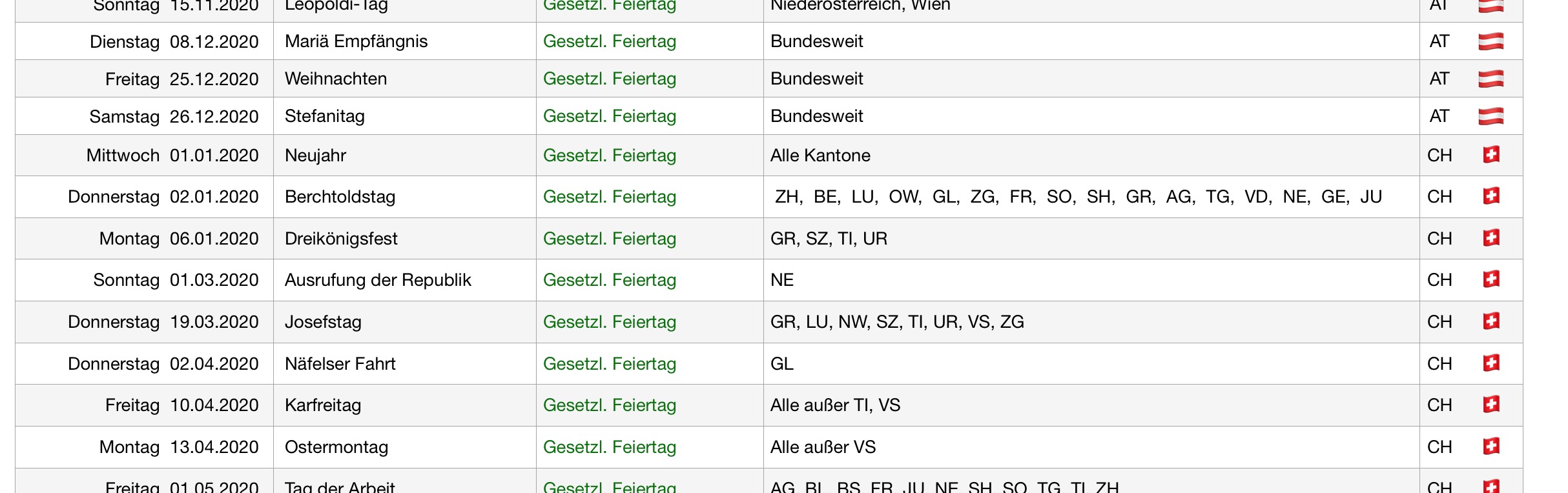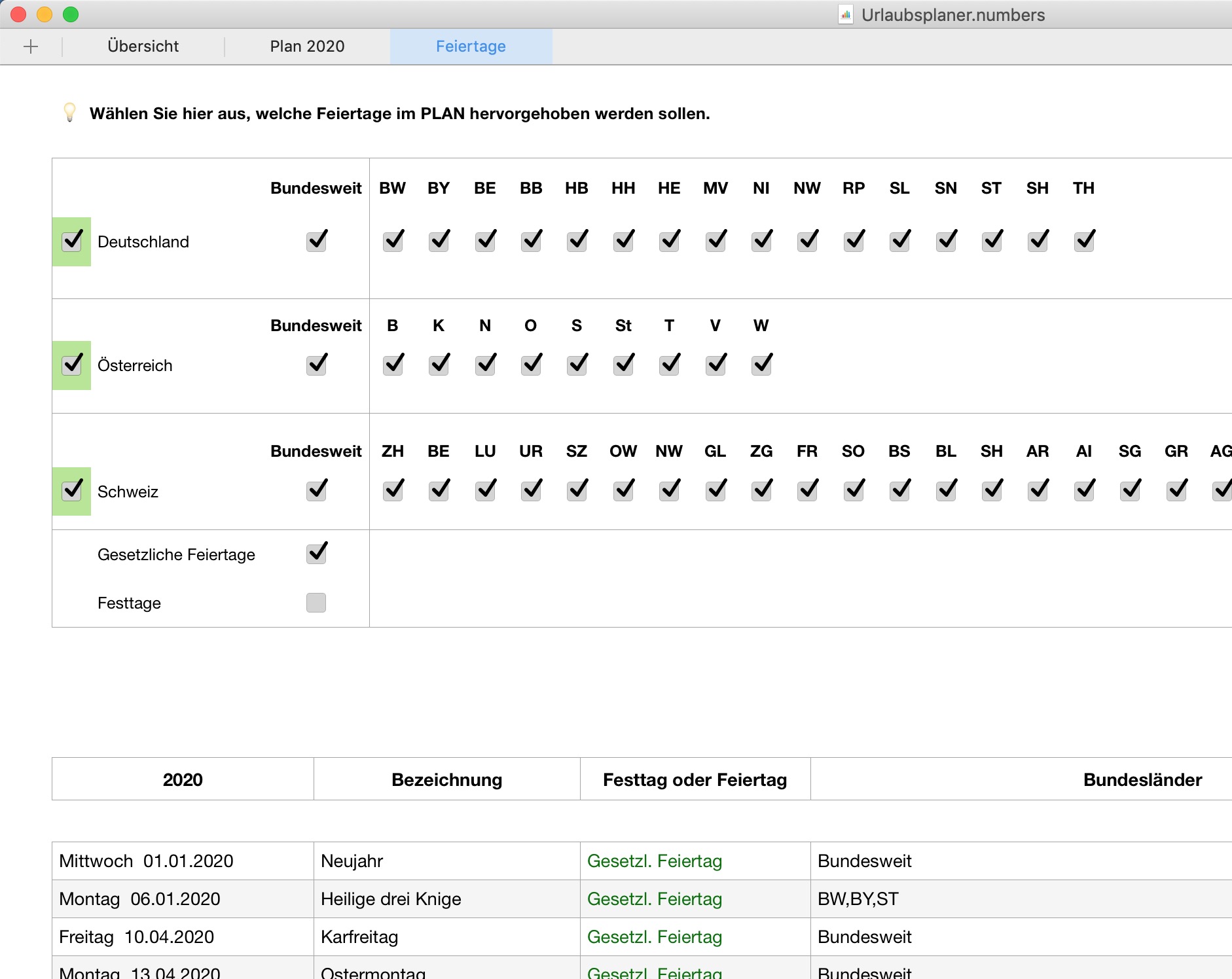NEU    Feiertage und Festtage für D / A / CH können in einer Liste angezeigt werden. Die Anzeige kann gefiltert werden nach Land, Bundesland/Kanton und Feiertag oder Festtag. Diese Tage werden in der Planung farbig hervorgehoben sodass sie beim Eintragen des Urlaubs zu sehen sind.