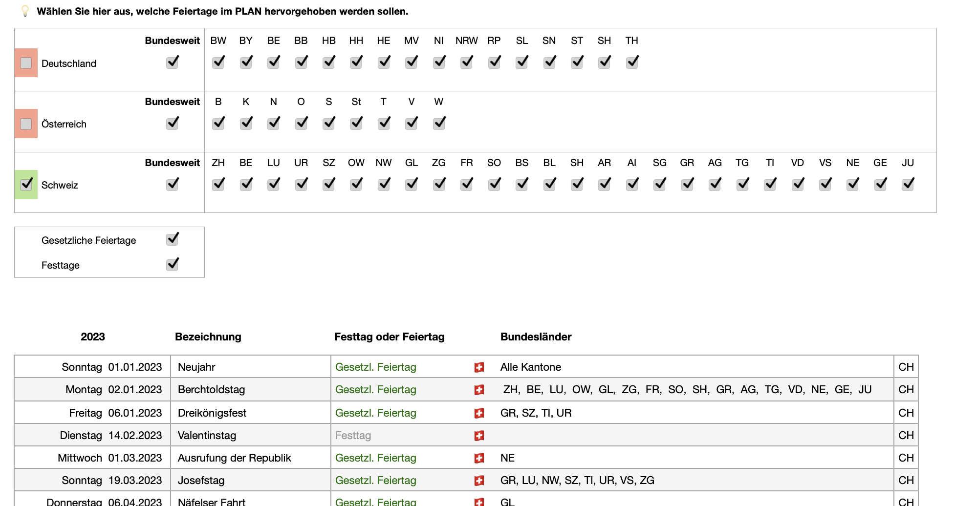 - Auswahl der gewünschten Feiertage und Festtage und Anzeige in der Planung