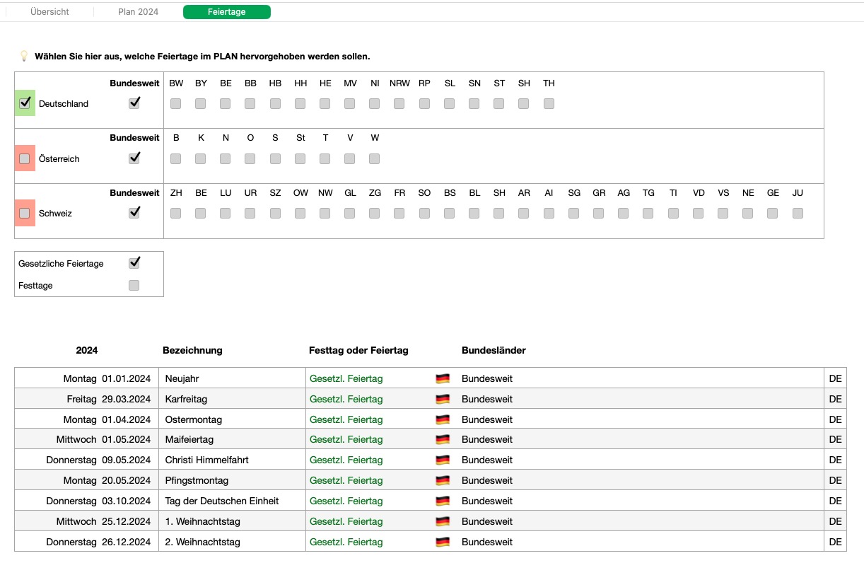 - Auswahl der gewünschten Feiertage und Festtage und Anzeige in der Planung