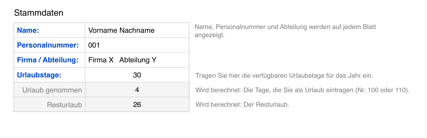 Für die persönlichen Stammdaten gibt es 3 frei belegbare Felder (z.B. Name, Personalnummer, Firma) die auch auf allen Monatsblättern in der Kopfzeile angezeigt werden.