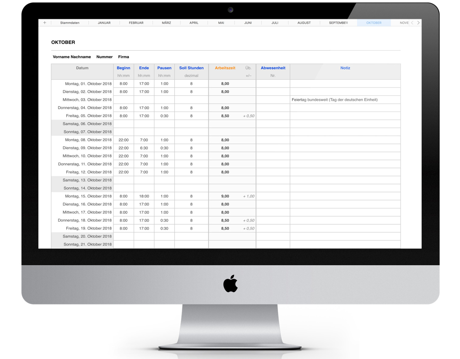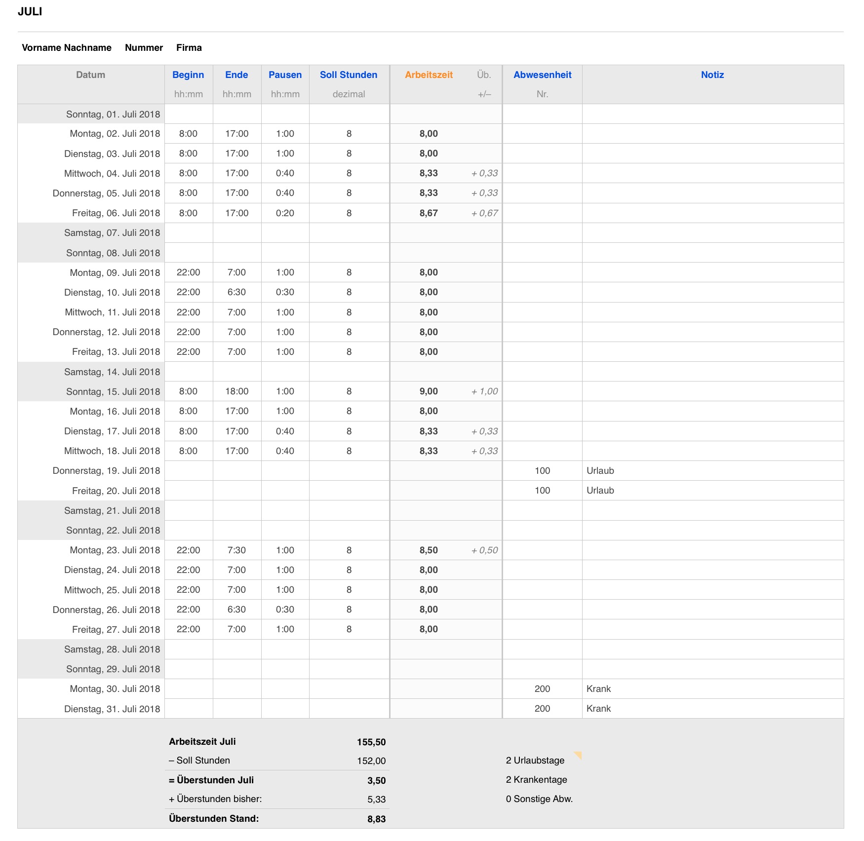 Pro Tag ist eine Zeile mit Datum vorgegeben. Jeder Monat ist auf einem eigenen Blatt mit übersichtlicher Summe der Arbeitszeit, Überstunden und Urlaubstage.