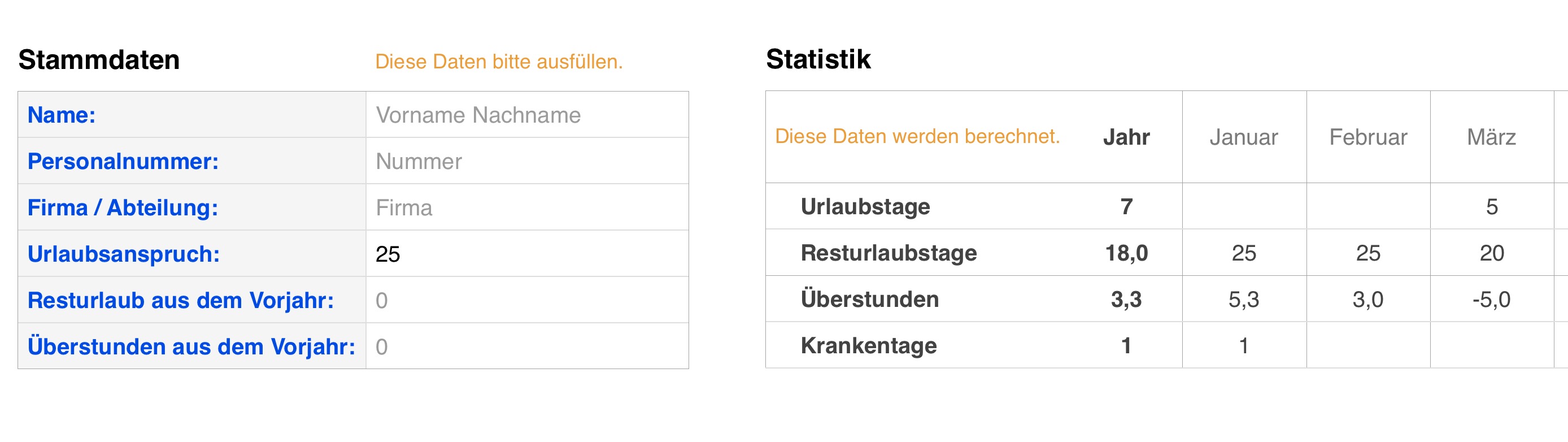 Für die persönlichen Stammdaten gibt es 3 freie Felder (z.B. Name, Personalnummer, Firma) die dann auf allen Monatsblättern in der Kopfzeile sichtbar sind.