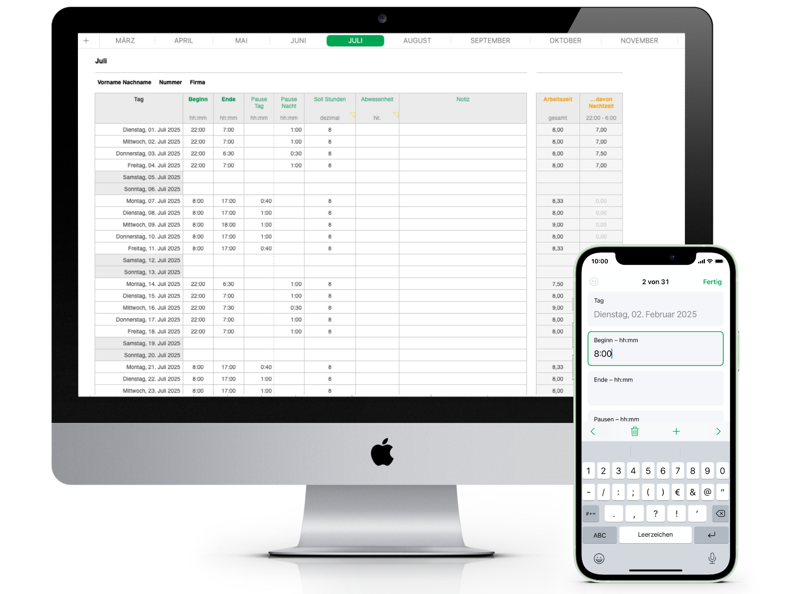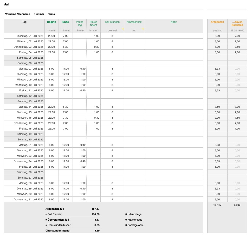 Die tägliche Arbeitszeit wird mit der anteiligen Nacht-Zeit errechnet. Die Überstunden im aktuellen Monat sowie die im Jahr aufgelaufenen Überstunden sind auf jedem Blatt für den jeweiligen Monat dargestellt.
