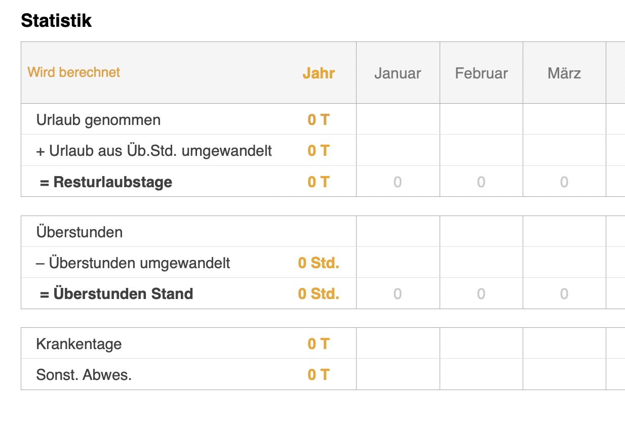 • die Anzahl der eingetragenen Urlaubstage und Krankheitstage (je Monat und ganzes Jahr)