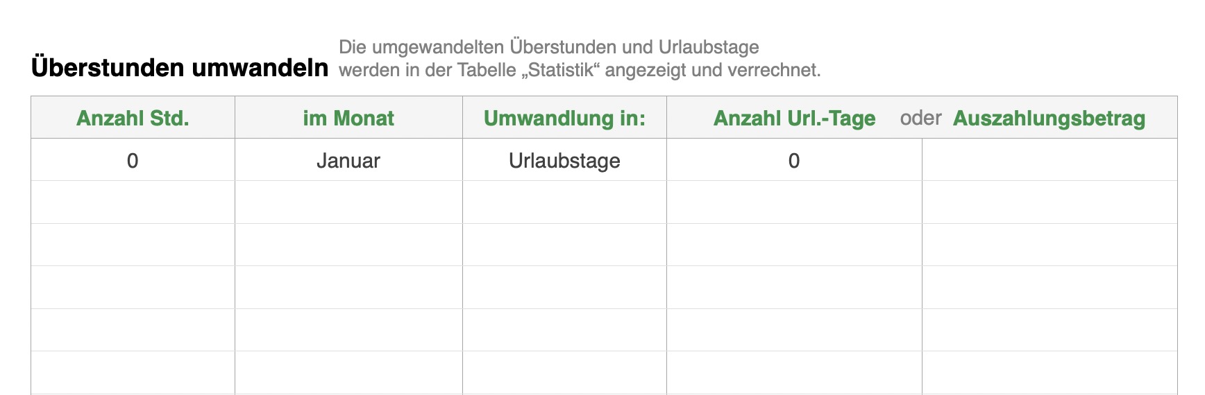 In einer eigenen Tabelle können Überstunden in Urlaubstage oder eine Auszahlung umgewandelt werden. Dies wird in der Statistik und im Monatsblatt entsprechend angezeigt.