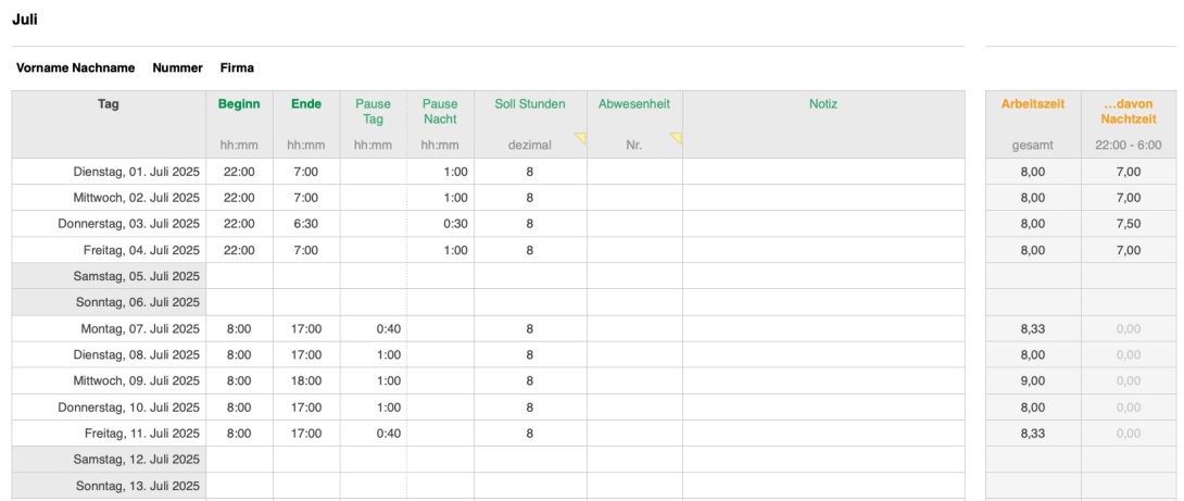 • Arbeitszeit (Beginn, Ende, Pausendauer Tag, Pausendauer Nacht)