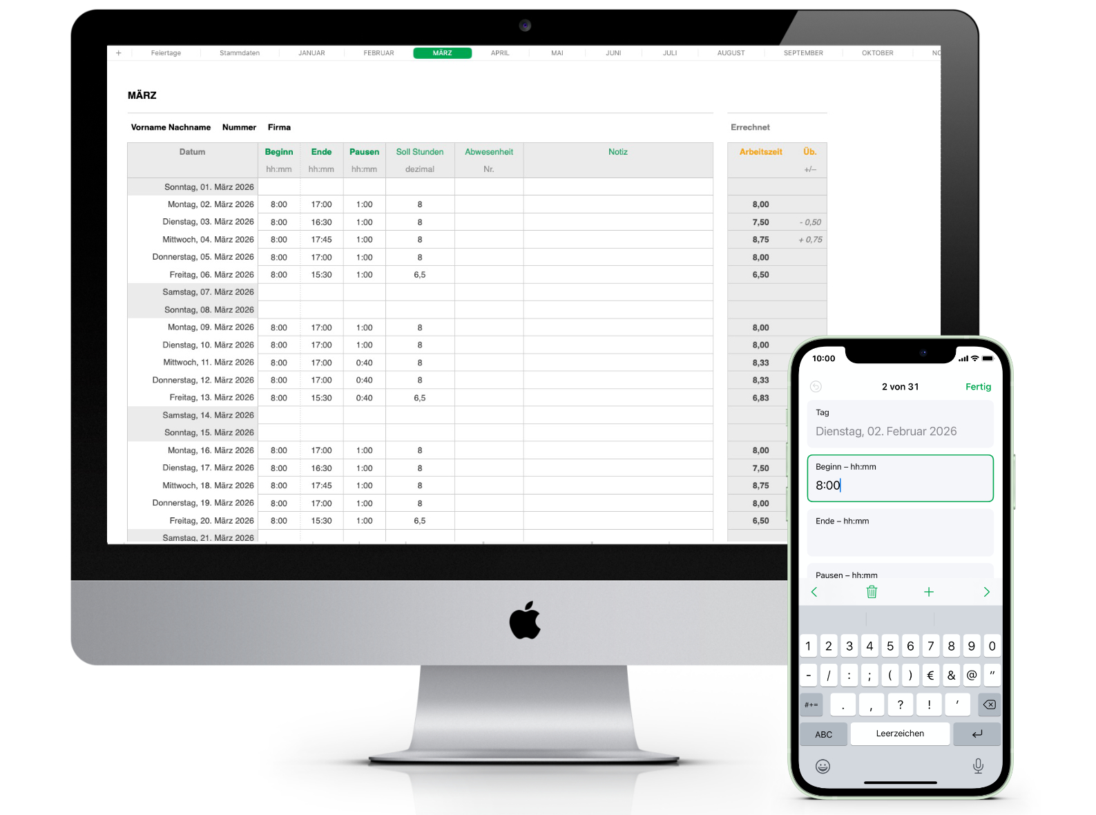 - Optional: die Soll-Arbeitszeit für die Berechnung von Überstunden