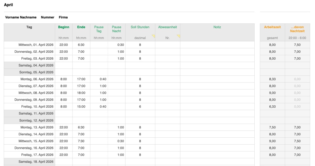 - Arbeitszeit (Beginn, Ende, Pausendauer Tag, Pausendauer Nacht)