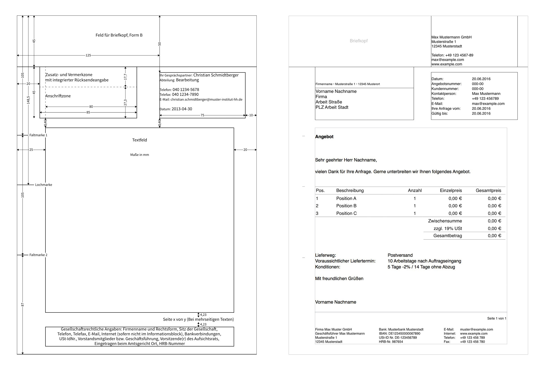Sie erhalten zwei Vorlagendateien für das Layout mit 27mm Briefkopf (Form A) und mit 45mm Briefkopf (Form B).