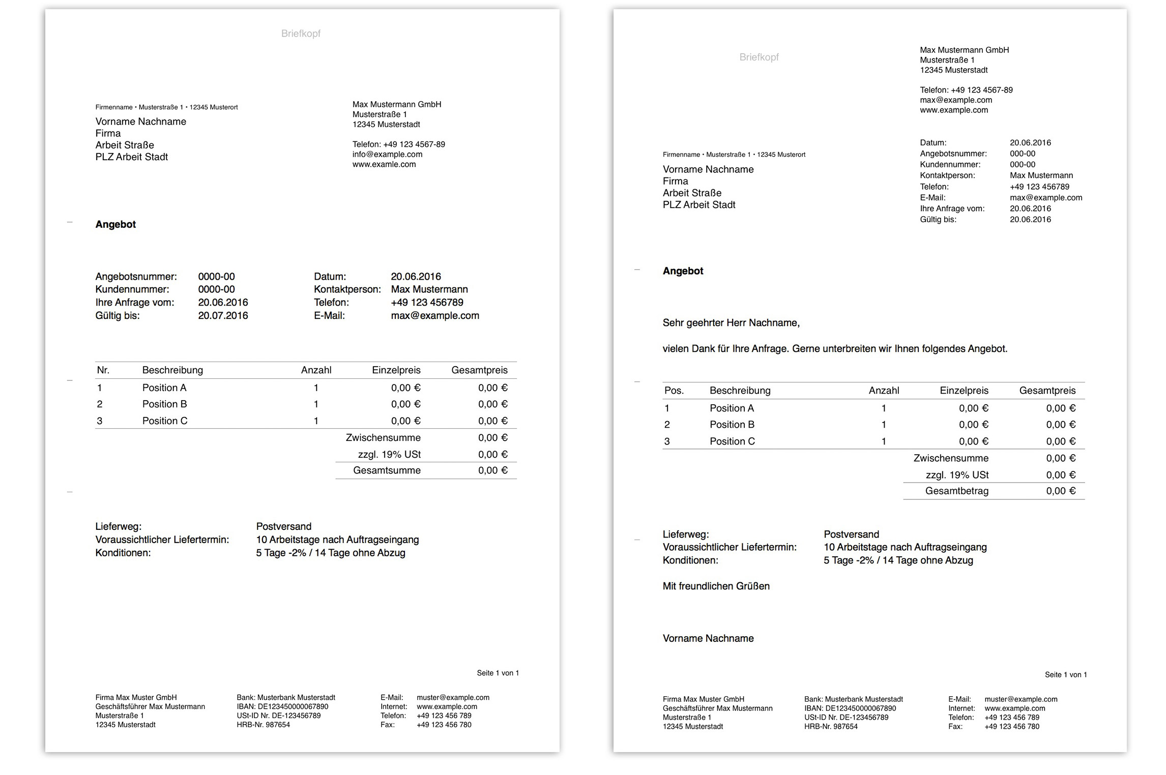 Die Vorlage enthält neben der Angebotstabelle diese Angaben: