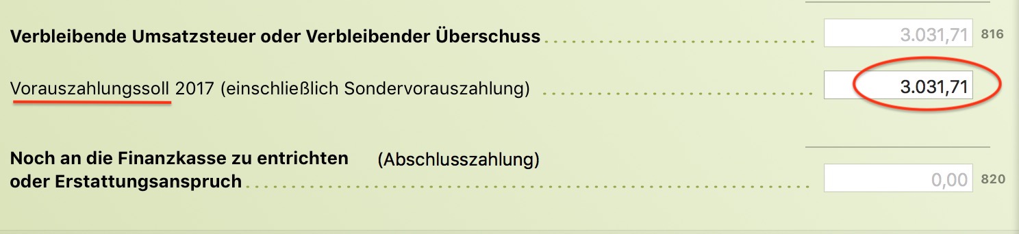 Wenn Sie die inländische (deutsche) Umsatzsteuer-Jahreserklärung ausfüllen, werden Sie nach dem "Vorauszahlungs-Soll" gefragt, den Sie ebenfalls in der Ausfüllhilfe ablesen können.