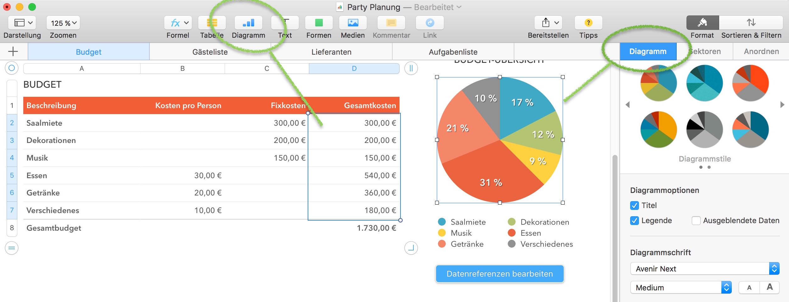 Das Hinzufügen von Diagrammen ist einfach. Man wählt diejenigen Zellen aus, deren Ergebnisse dargestellt werden sollen und wählt dann den gewünschten Diagrammtyp aus. Danach kann man das Diagramm anpassen und die Art des Diagramms auch später noch ändern.
