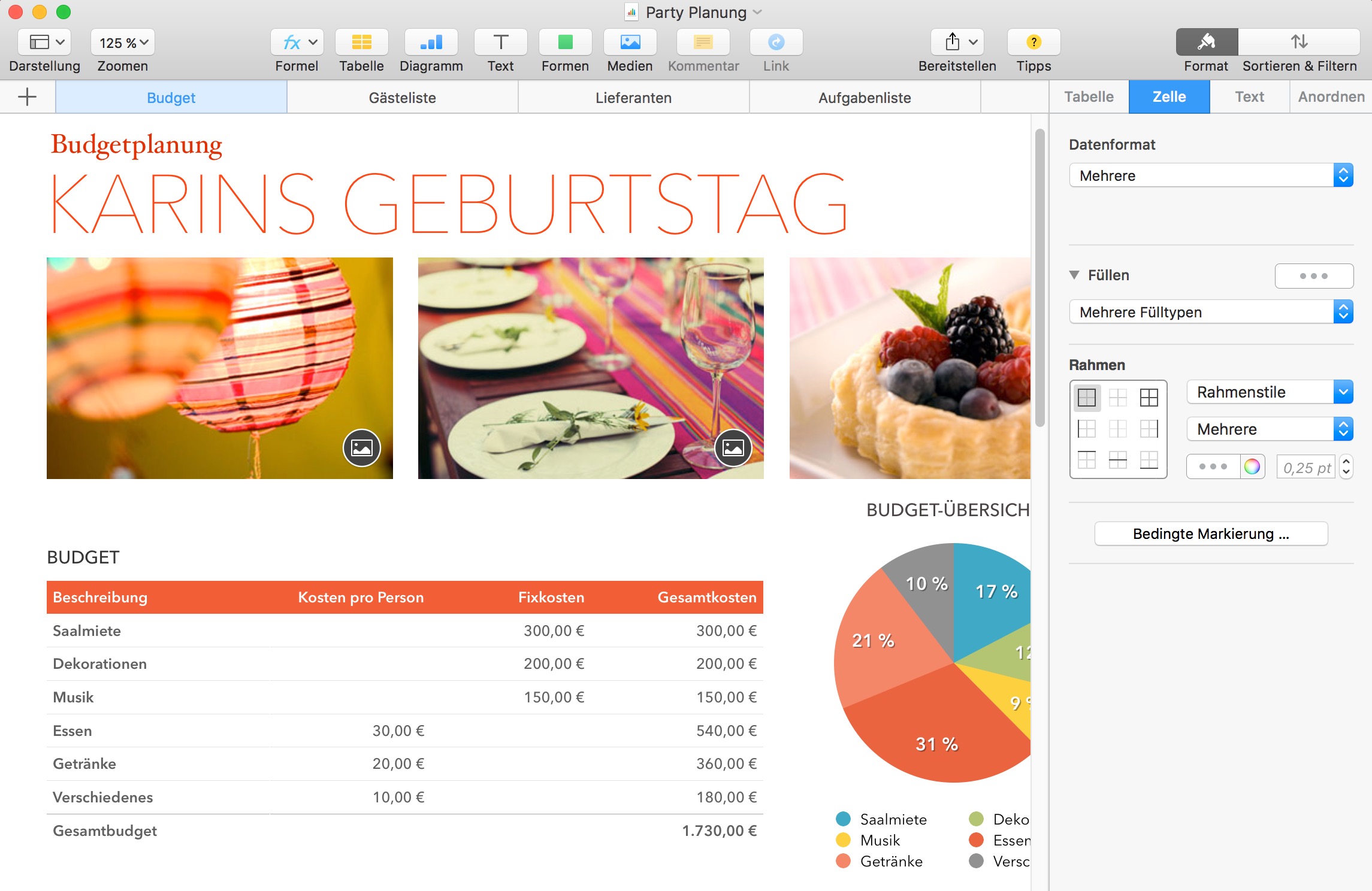 Um Tabellen und andere Objekte zu bearbeiten, lässt sich auf der rechten Seite des Fensters die Fromatierungspalette einblenden. Hier können alle Einstellungen wie Schriften, Farben, Rahmen und Datenformate etc. vorgenommen werden.