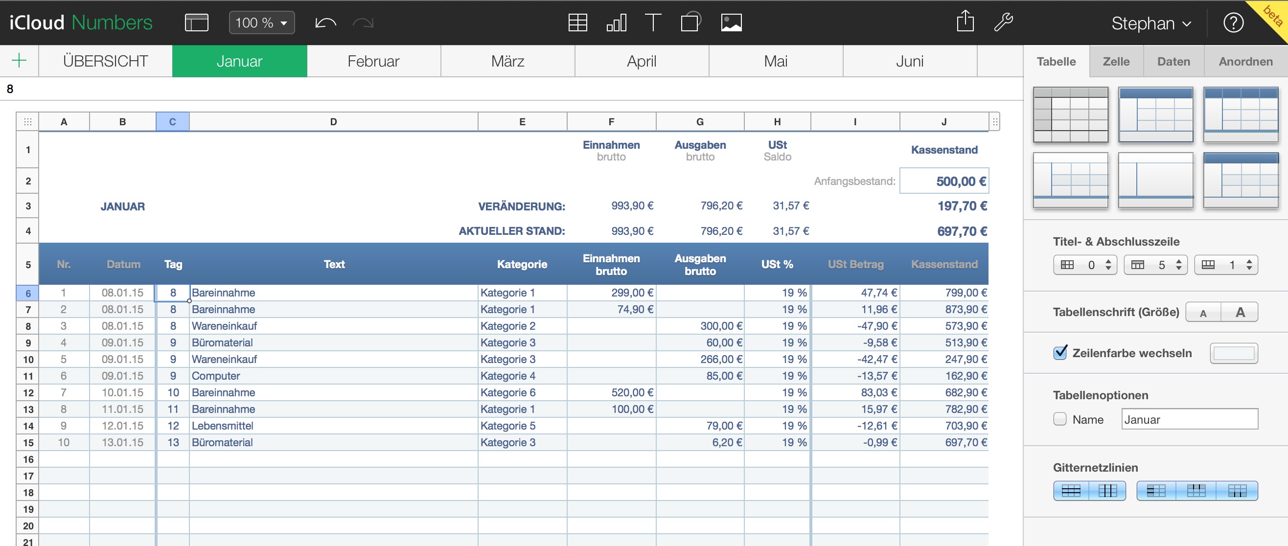 Numbers bietet die Möglichkeit, mit beliebig vielen Tabellen auf mehreren "Blättern" zu arbeiten. So kann man umfangreiche Datensammlungen gut organisieren. Beispielsweise kann man für jeden Monat ein eigenes Blatt anlegen und die Resultate in einem Übersichtsblatt zusammenführen.