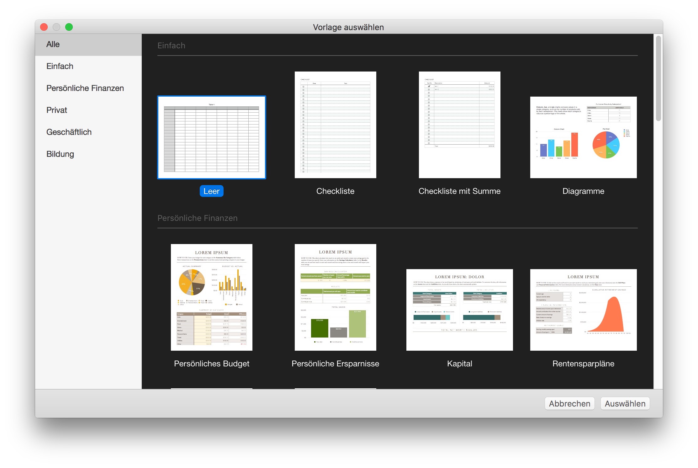 Tip: Man kann hier eigene Vorlagen hinzufügen indem man sie im Dateivorlagen-Format speichert. Weil deren Verwaltung aber auf das Umbenennen und Löschen beschränkt ist, dürfte es für die meisten Fälle sinnvoll sein, die eigenen Vorlagen im Finder zu organisieren.