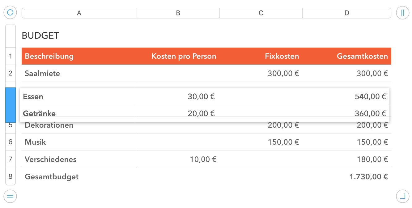 Eine Tabelle besteht aus Zeilen und Spalten. Zeilen, Spalten und einzelne Zellen können innerhalb einer Tabelle und zwischen Tabellen bewegt werden. Um z.B. eine oder mehrere Zeilen zu verschieben, markiert man sie am Zeilenkopf und zieht sie zur gewünschte Stelle.
