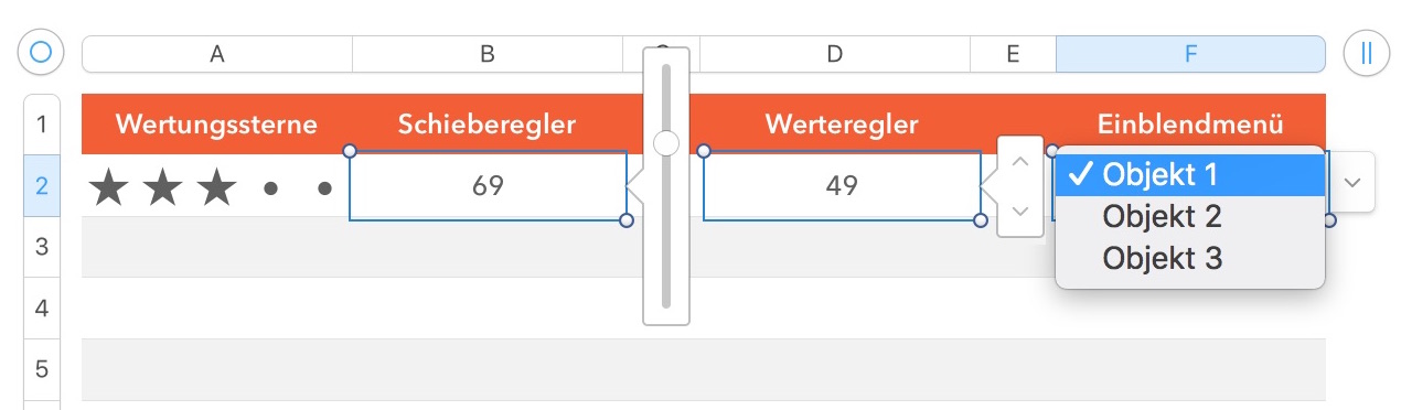 - Schieberegler – Um Zahlenwerte mit der Maus zu verändern, kann man den Schieberegler verwenden. Der Regler lässt sich verschieben womit sich der Wert in der Zelle erhöht oder verringert. Man kann das Maximum, Minimum und das Intervall festlegen sowie das angezeigte Zahlenformat (Euro, Prozent etc.) mit Ausnahme von Zeit und Dauer.