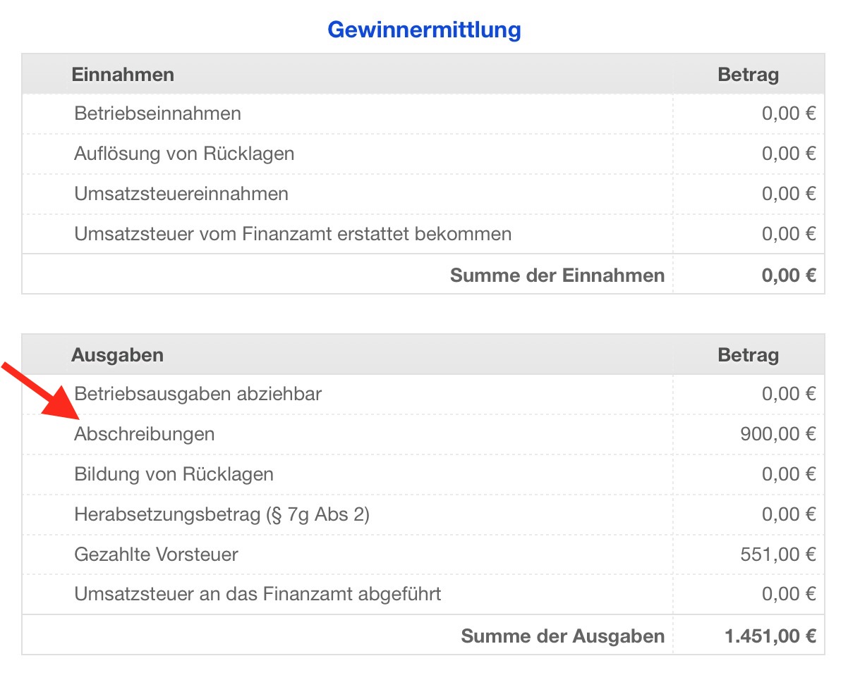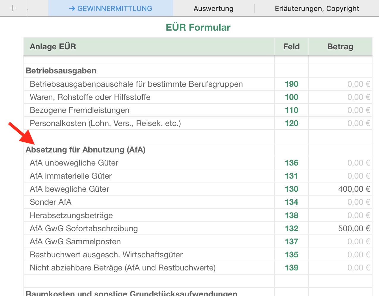 Die EÜR-Vorlage berechnet Abschreibungen für Wirtschaftsgüter. Die Ergebnisse werden sowohl in der Gewinnermittlung als auch für das Steuerformular "Anlage EÜR" angezeigt. Dort sind sie Teil der Betriebsausgaben. Die Berechnung erfolgt automatisch.