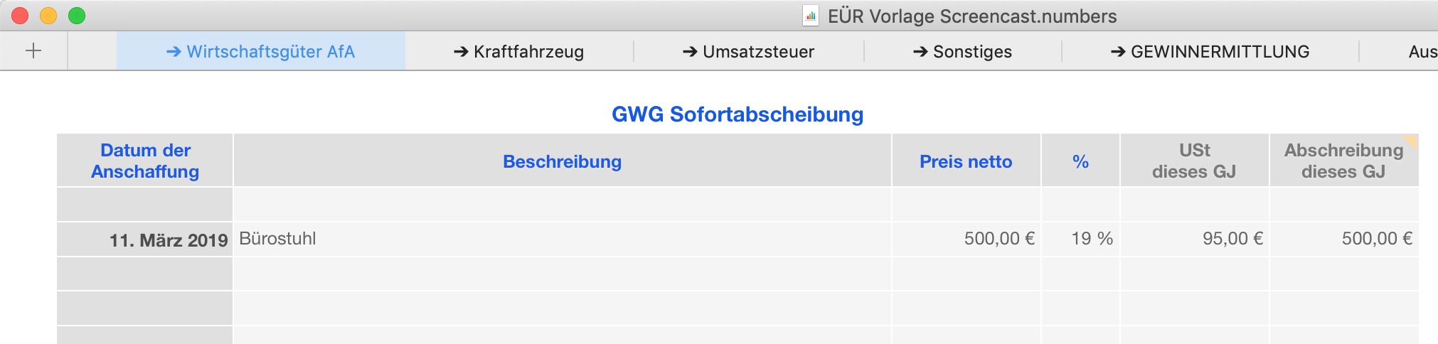 Geringwertige Wirtschaftsgüter (GWG) können in dieser Vorlage mit beiden Methoden sowohl "Sofort" als auch per "Sammelposten" erfasst werden.