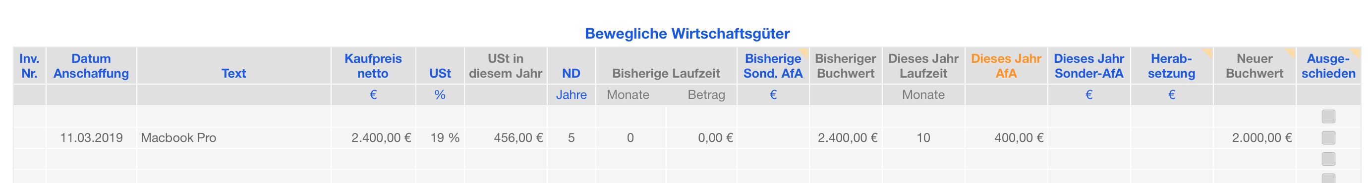 Darüber hinaus können alle weiteren Wirtschaftsgüter über die Tabellen Bewegliche-, Unbewegliche- und Immaterielle Wirtschaftsgüter abgeschrieben werden.